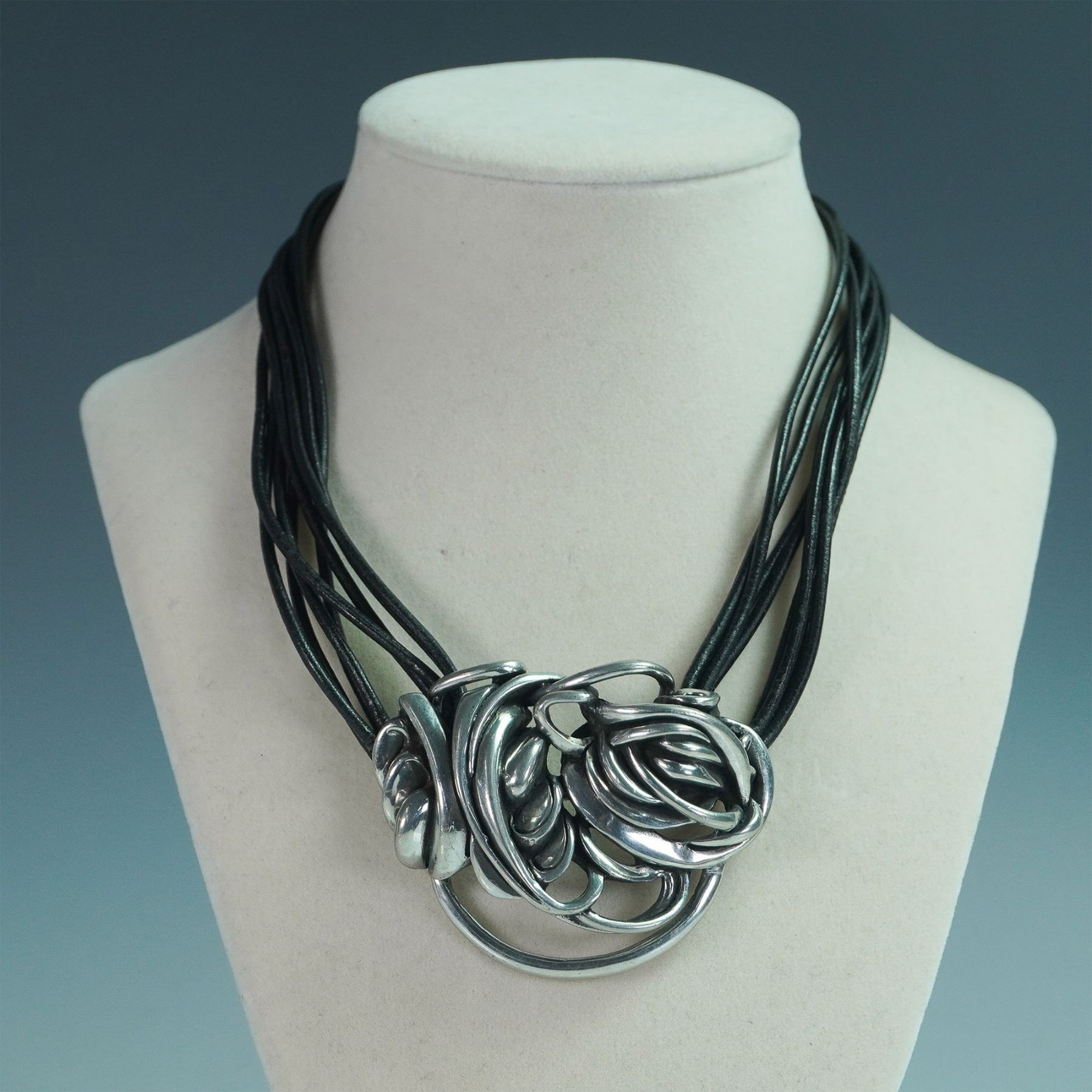 Striking contemporary necklace featuring multiple strands of black vinyl cord supporting a sculptural silver-tone metal centerpiece. The intertwined design creates a bold, modern aesthetic, blending industrial and organic elements. Secured with a lobster clasp and an adjustable extender chain for a customizable fit. An eye-catching piece perfect for making a statement.