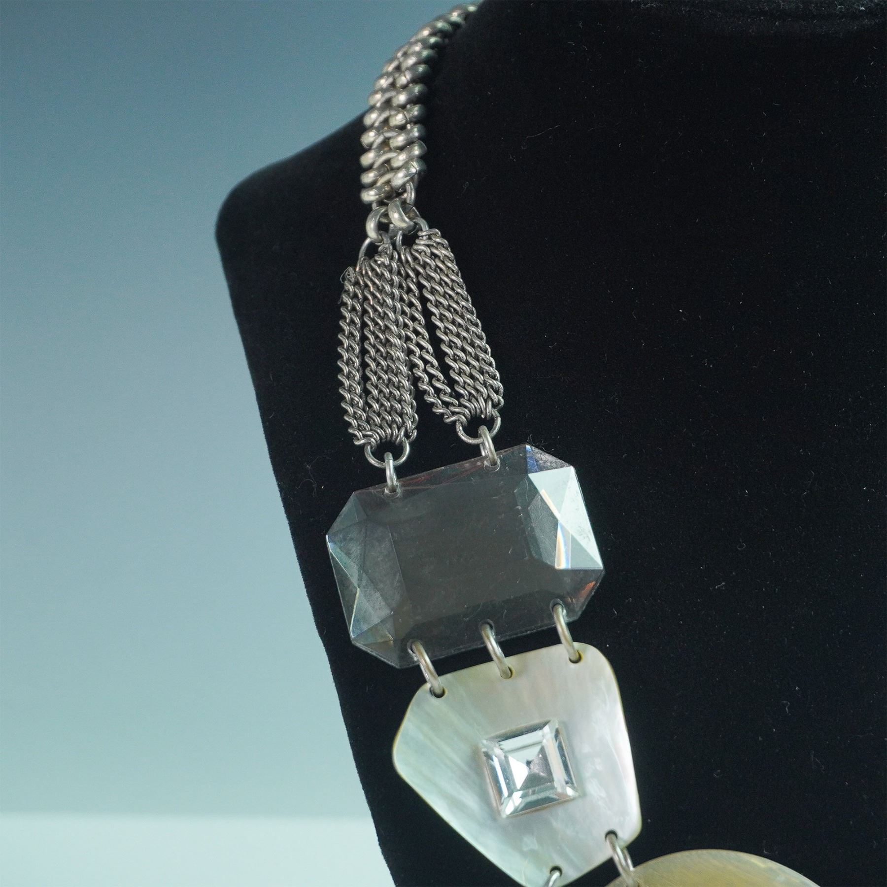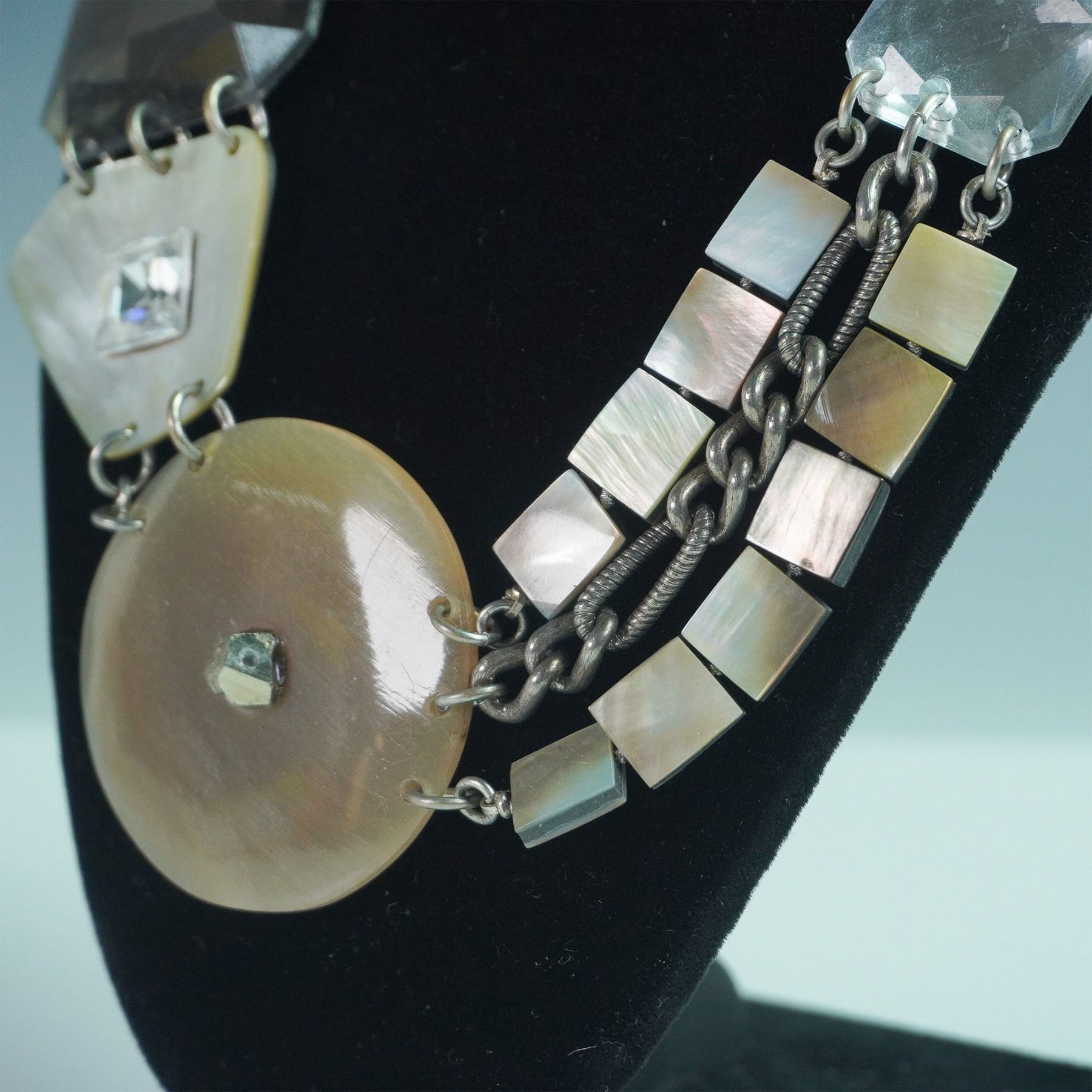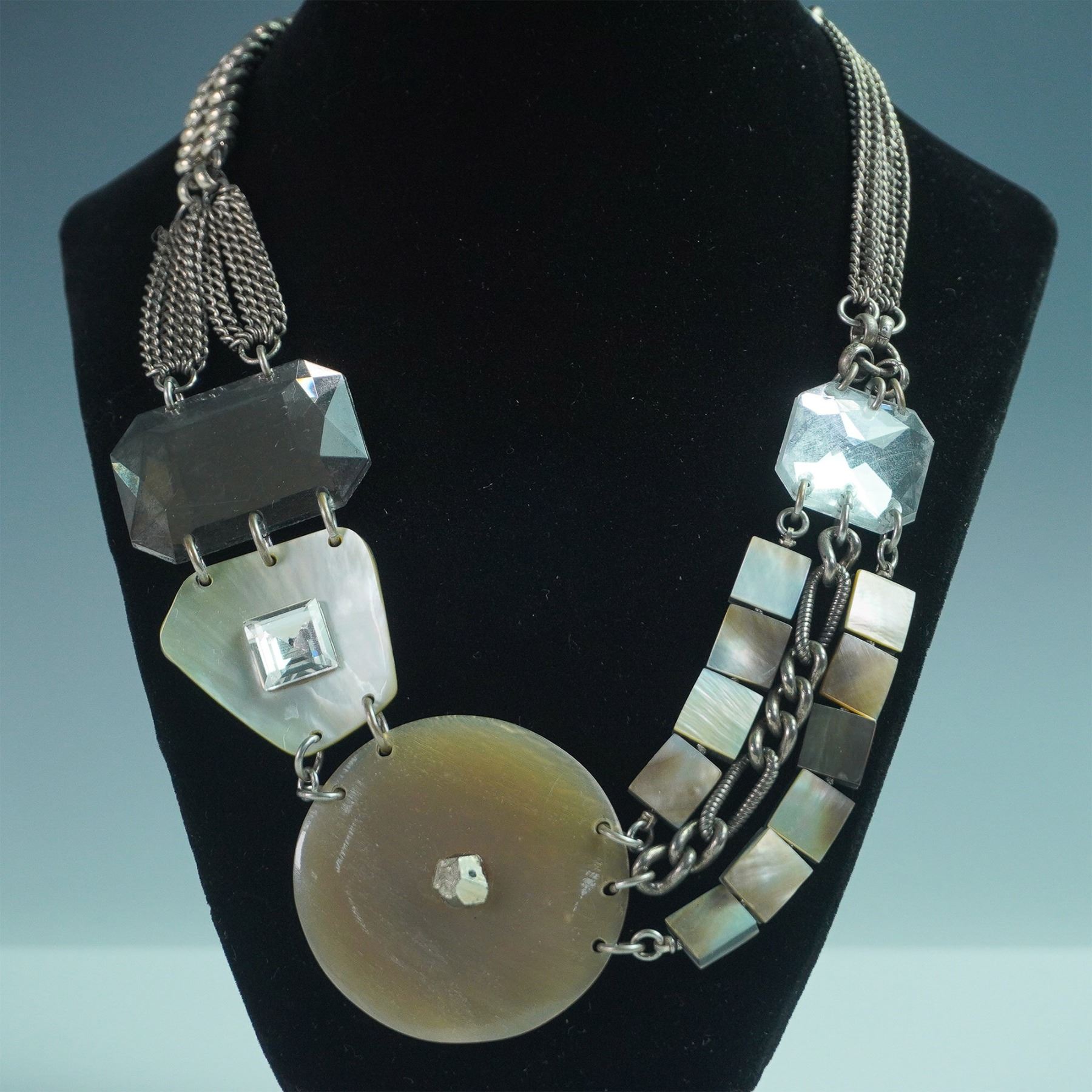 This bold and contemporary statement necklace features a striking asymmetrical design with an eclectic mix of materials. The silver-tone metal framework is adorned with faceted glass stones, geometric mother-of-pearl inlays, and a circular resin pendant with a raw crystal accent. The layered composition incorporates various chain textures and reflective elements, creating depth and movement. A lobster clasp closure ensures a secure and comfortable fit.