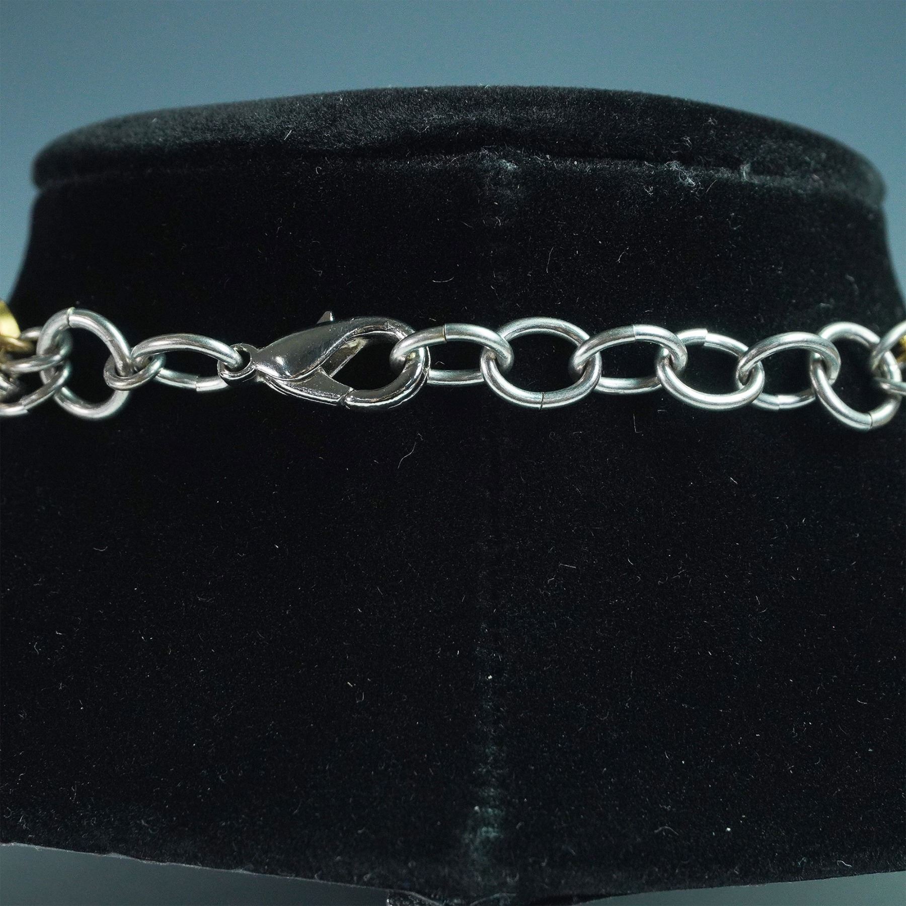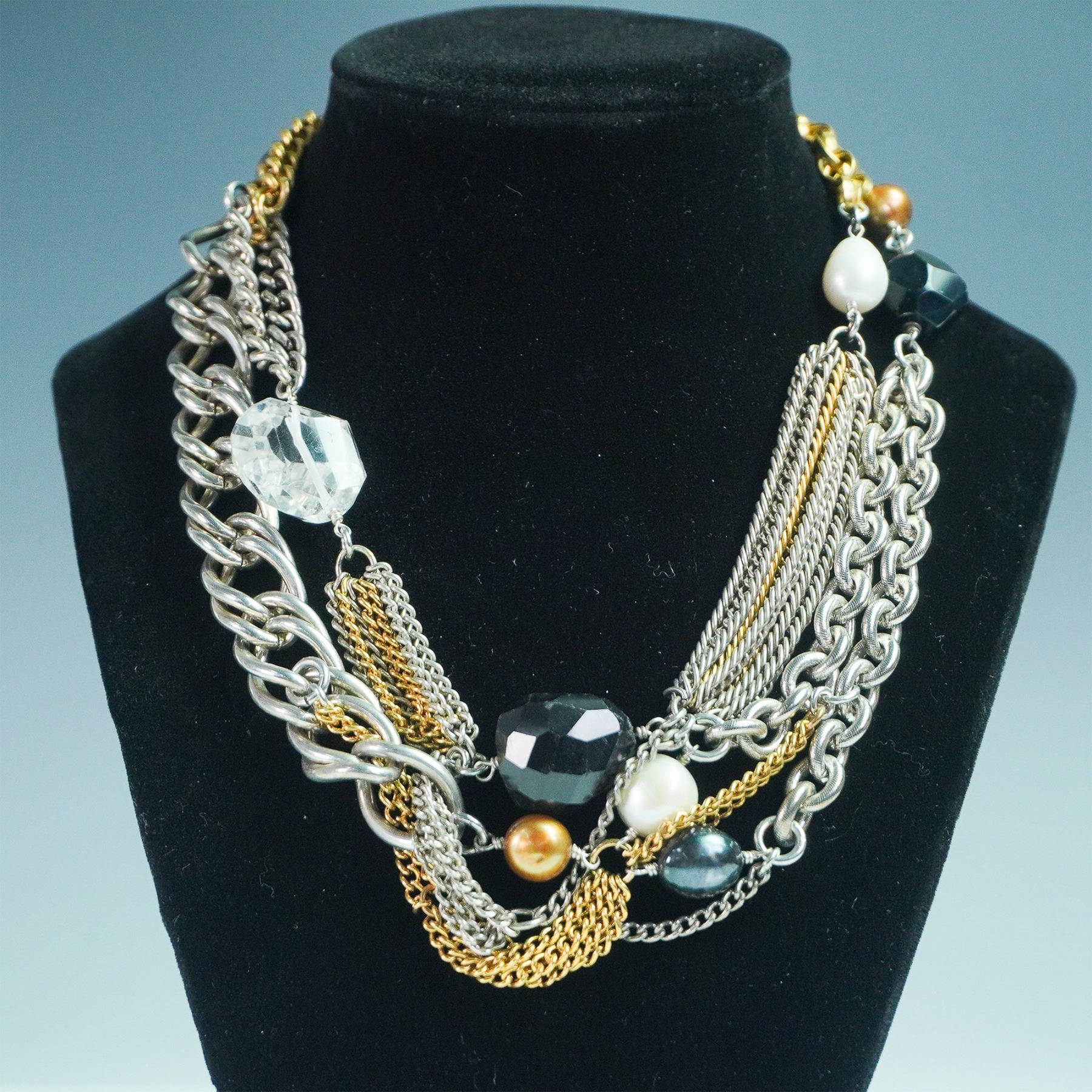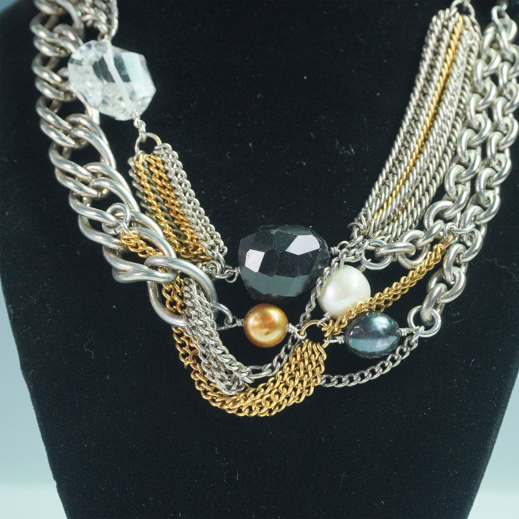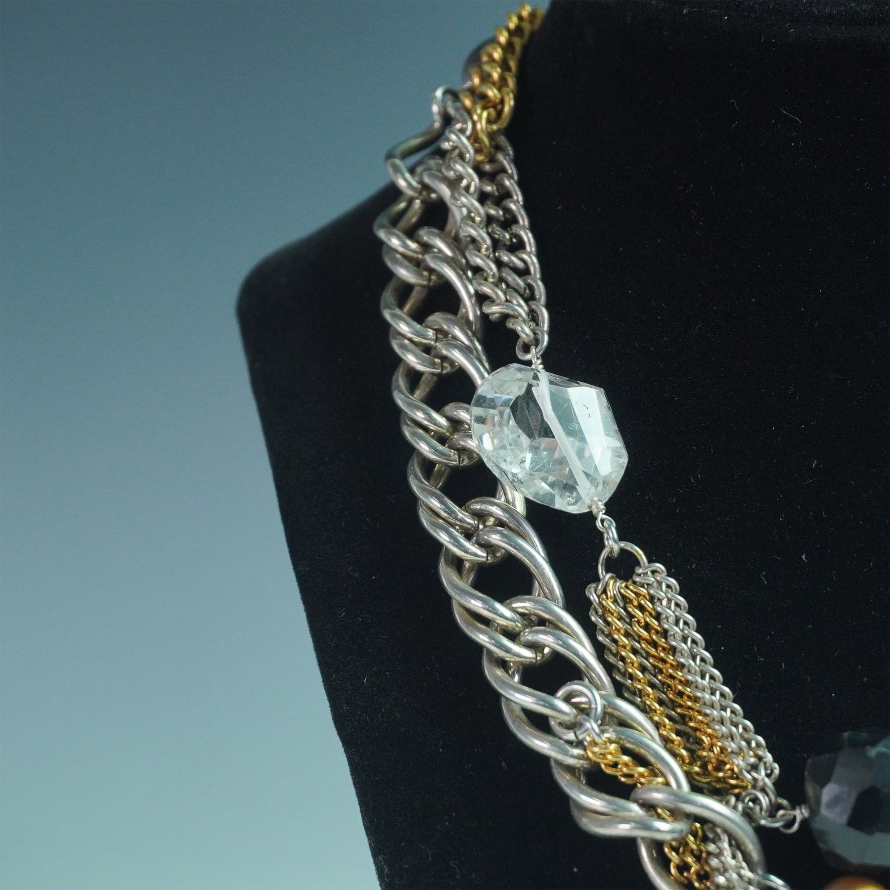 A striking 16-inch multi-strand necklace featuring an eclectic mix of silver and gold-toned metal chains interwoven with faceted gemstones and pearls. The bold design showcases a large faceted clear crystal, contrasting black and white pearls, and metallic bronze accents. The combination of chunky and delicate chain links creates a dynamic, layered effect, making this piece a standout statement accessory. The necklace is secured with a lobster clasp closure and an adjustable chain for versatile wear.
