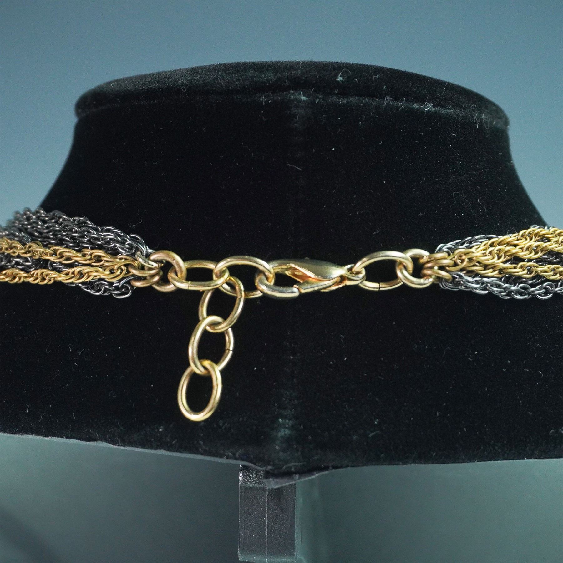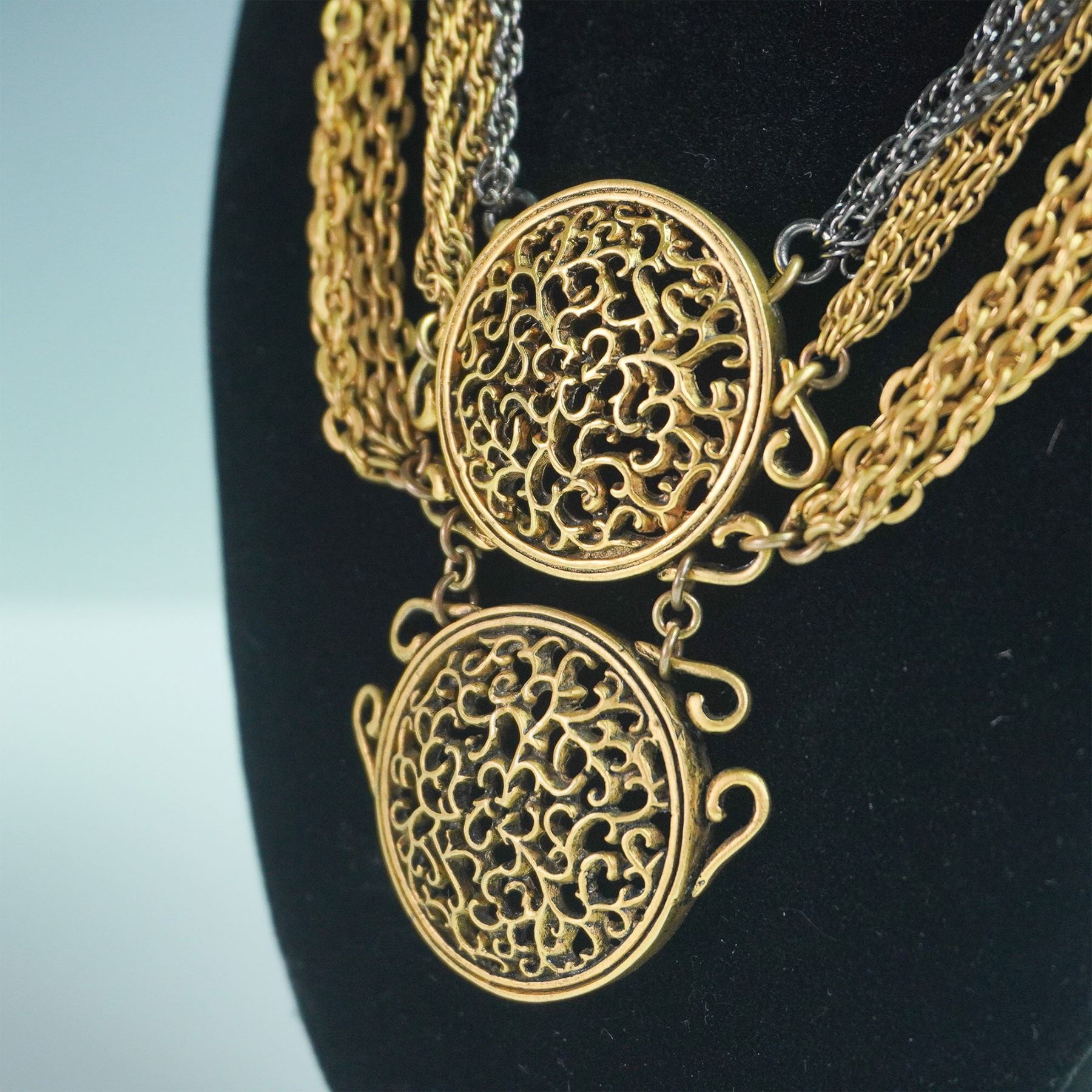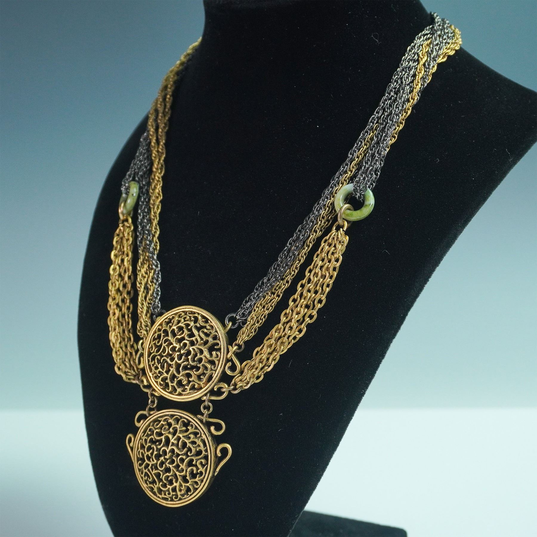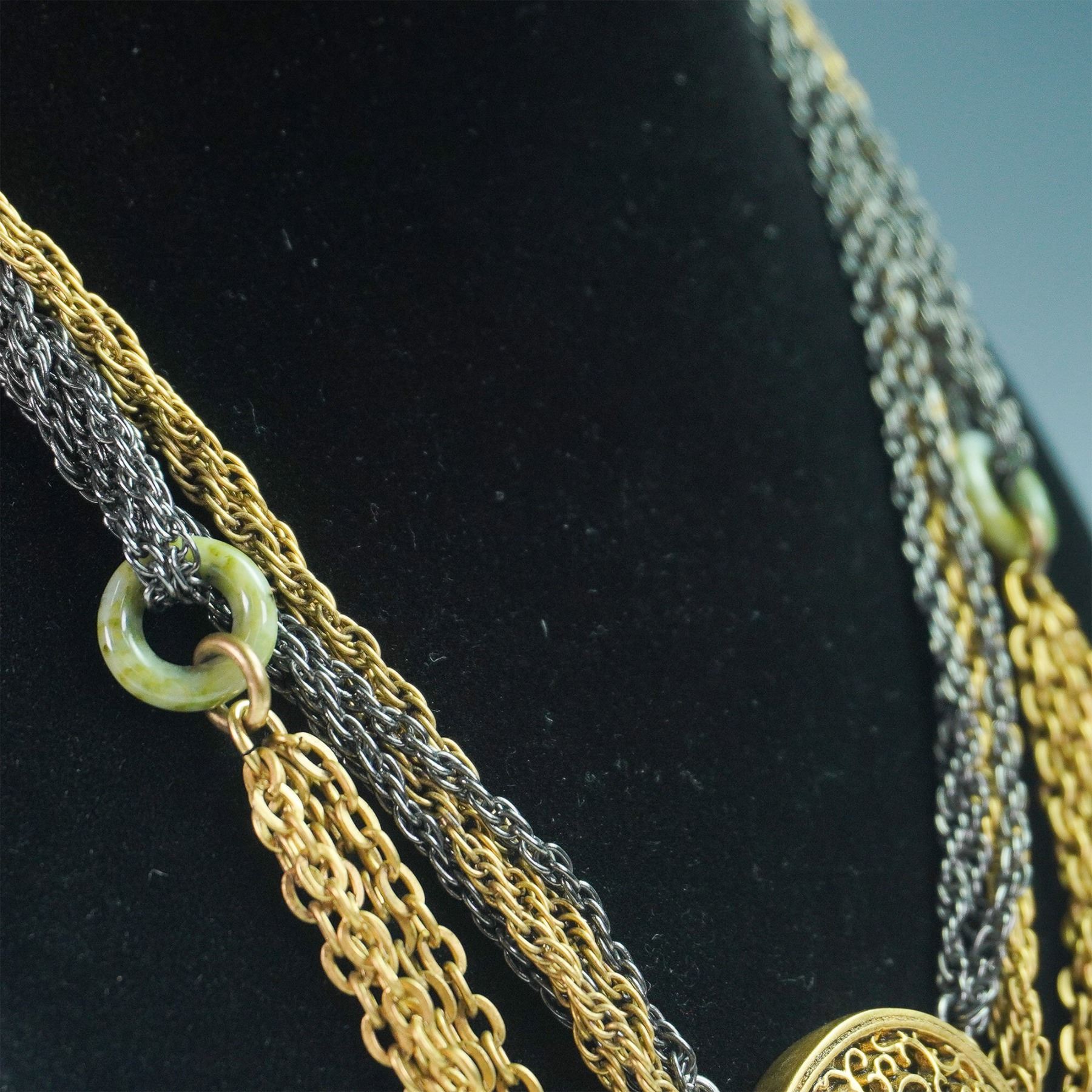 Striking multi-strand statement necklace featuring an intricate combination of gold-tone and gunmetal-tone chains. The centerpiece showcases two ornate filigree medallions with a vintage-inspired design, adding a bold and elegant touch. Accented with jade-tone rings connecting the strands for added contrast. Finished with an adjustable lobster clasp closure.