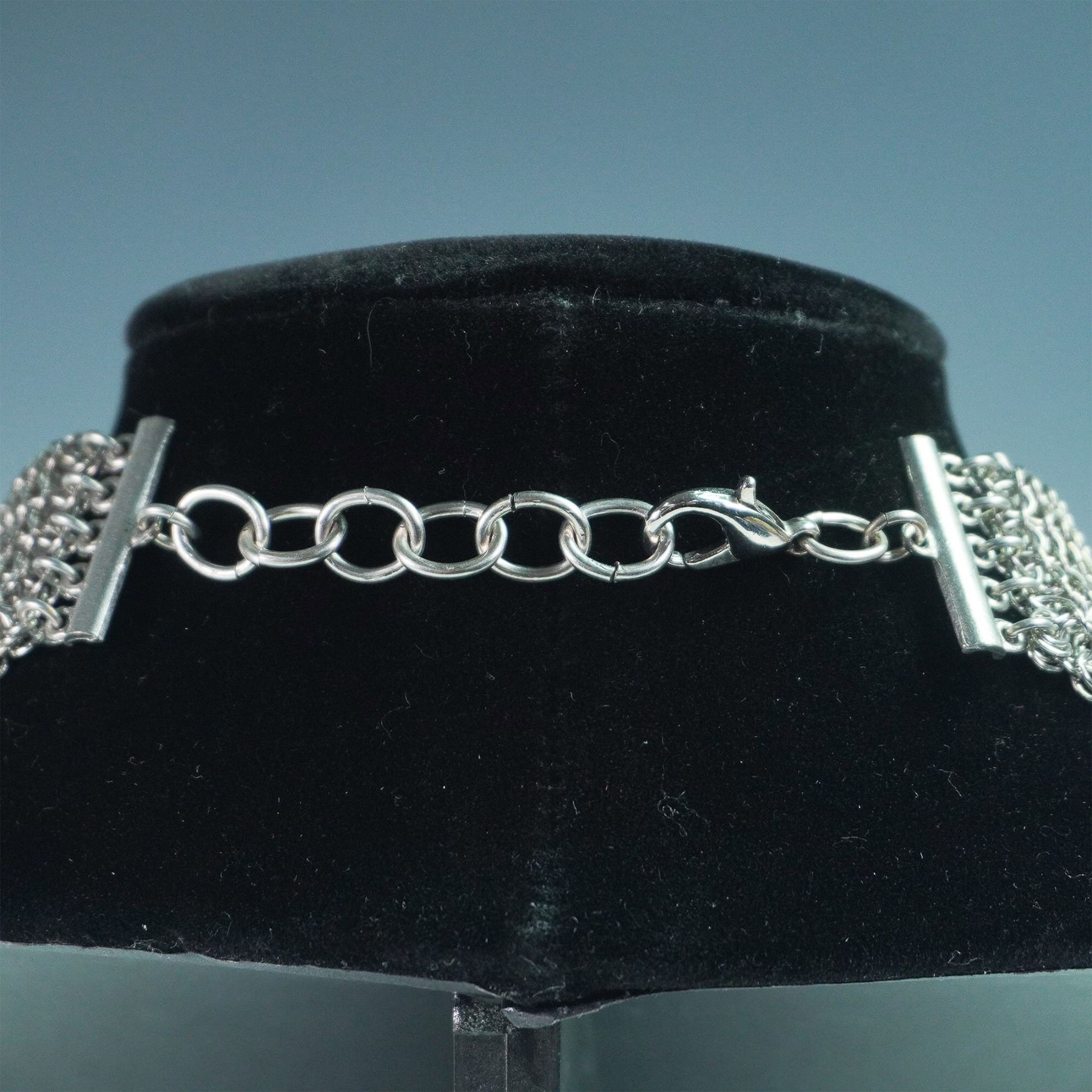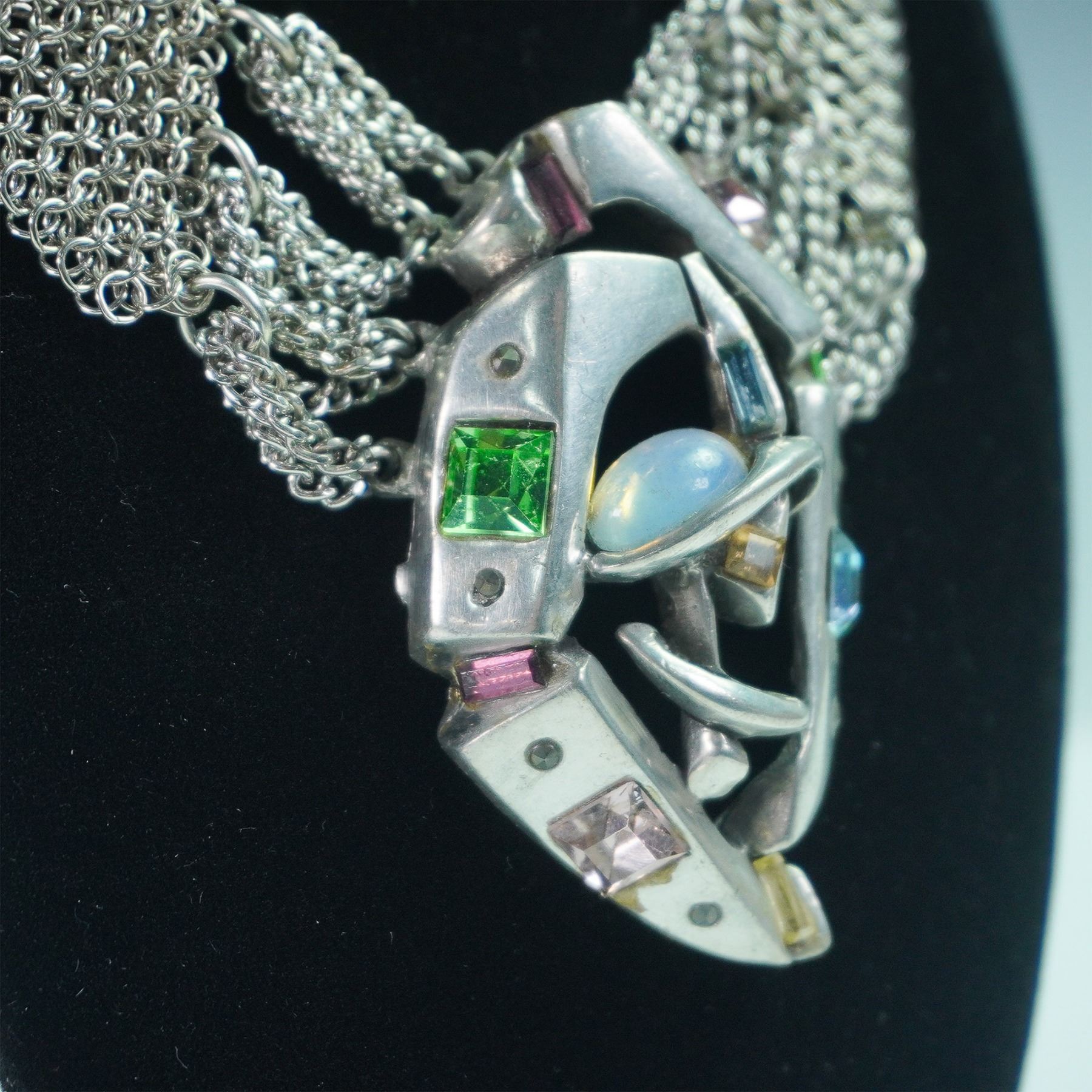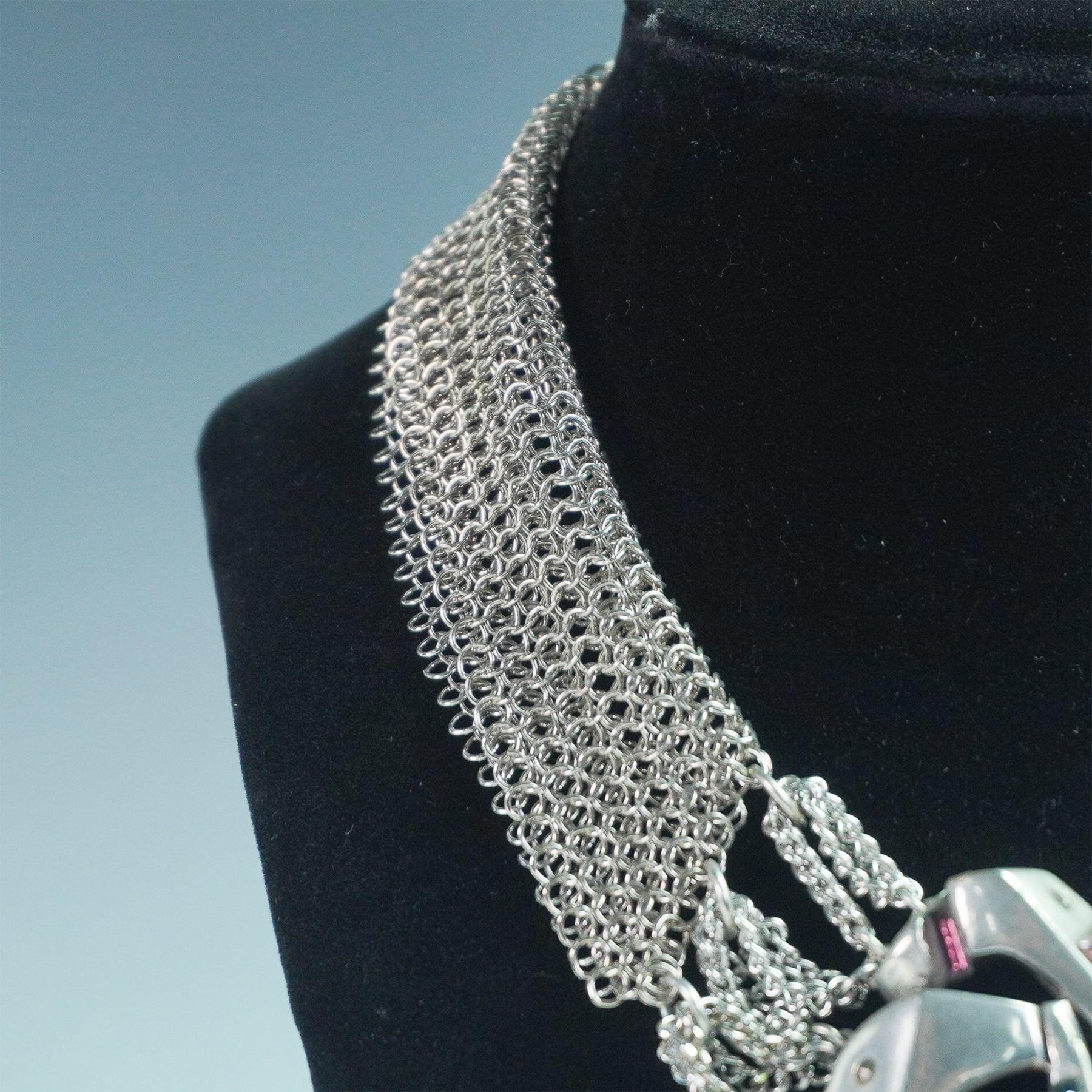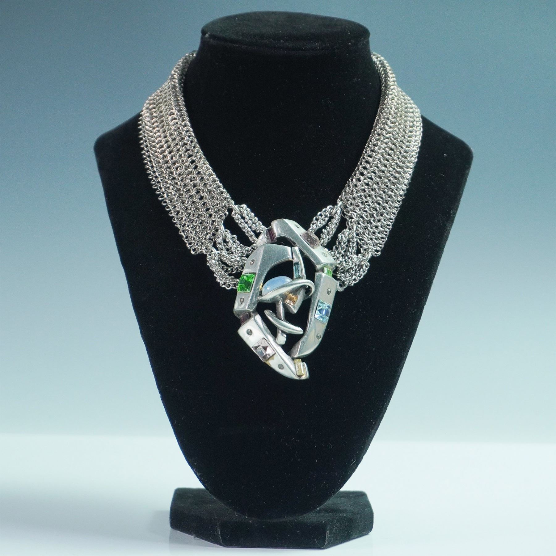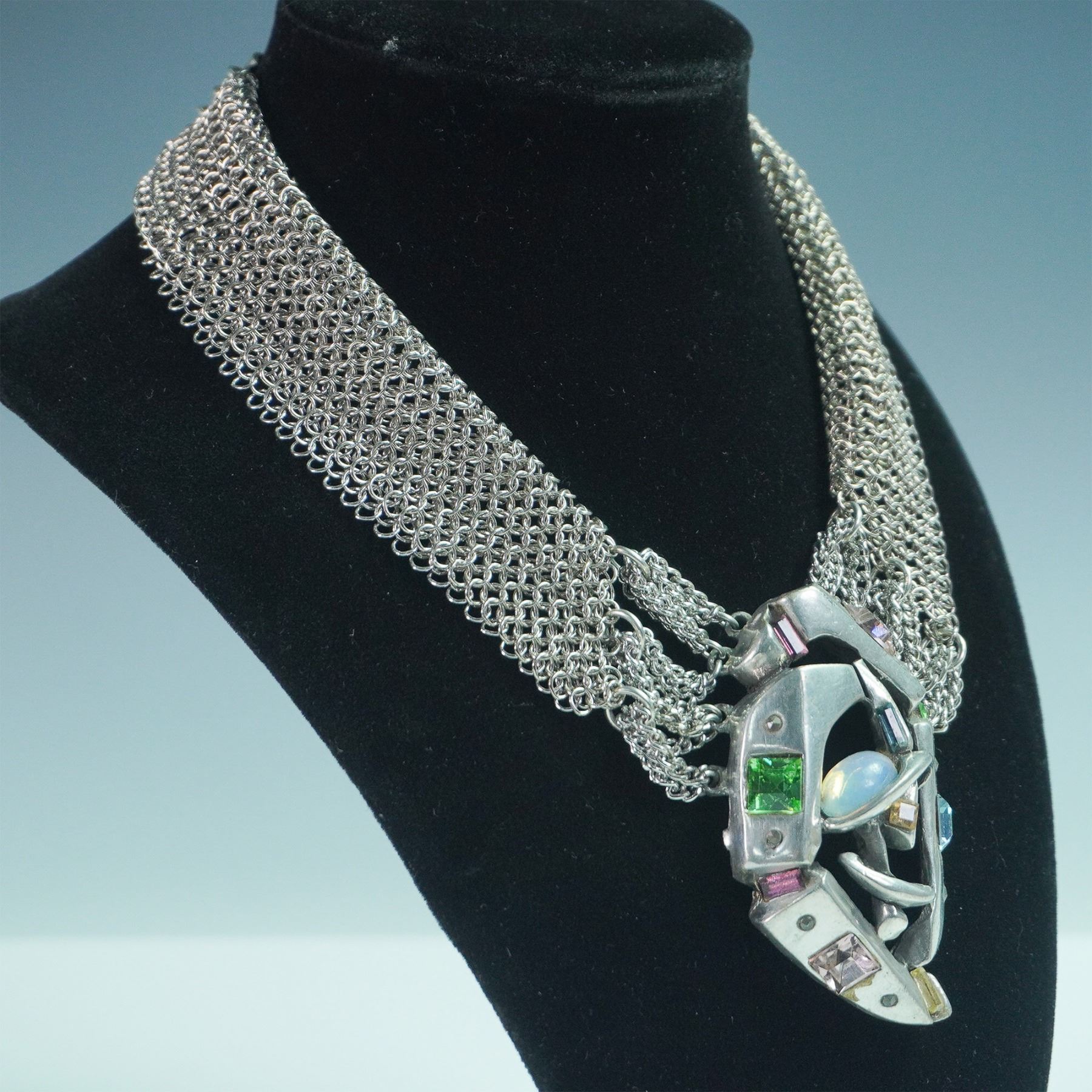 A striking and artistic statement piece, this 15-inch choker necklace by designer Connie Bates is titled "Multi Tango." The choker features an intricate multi-chain mesh design in a silver-tone finish, culminating in an abstract sculptural centerpiece. The pendant showcases a mix of faceted and cabochon-cut gemstones, including green, blue, pink, and yellow stones, along with an opalescent accent. The industrial-meets-artistic aesthetic is complemented by a sturdy lobster clasp closure and an adjustable extender. A bold and unique wearable art piece.