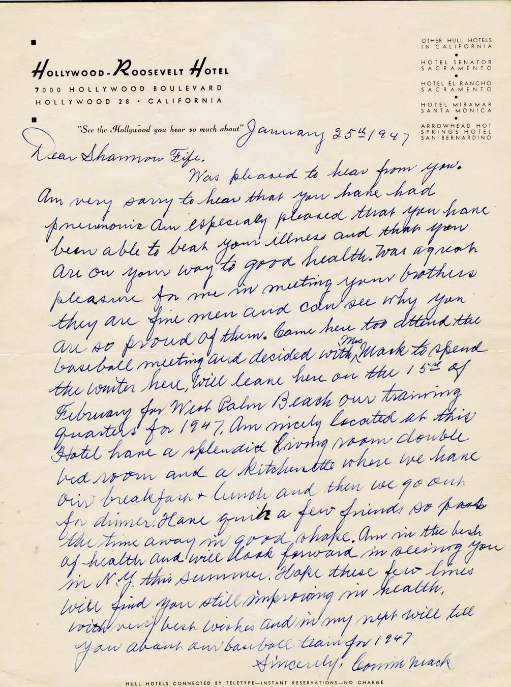 Autograph letter signed by Connie Mack. Ink letter written on Hollywood-Roosevelt Hotel Stationery dated 25 January 1947 reads in part ''...I came here to attend the baseball meeting and decided with Mrs. Mack to spend the winter here, will leave here on the 15th of February for West Palm Beach our training quarters for 1947...'' Letter signed to bottom ''Sincerely, Connie Mack.'' Single page letter measures 8.5'' x 10.5''. Slight but even toning throughout. Near fine.