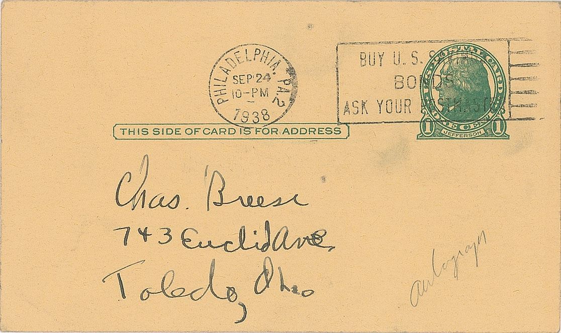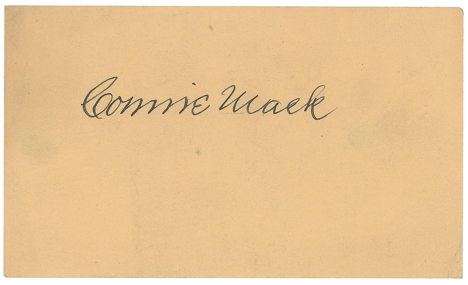 Vintage fountain pen signature, "Connie Mack," on an off-white 5.5 x 3.25 government postcard. Reverse addressed in Mack's own hand and postmarked in Philadelphia on September 24, 1938. In fine condition, with some scattered light soiling and two tiny tack holes.