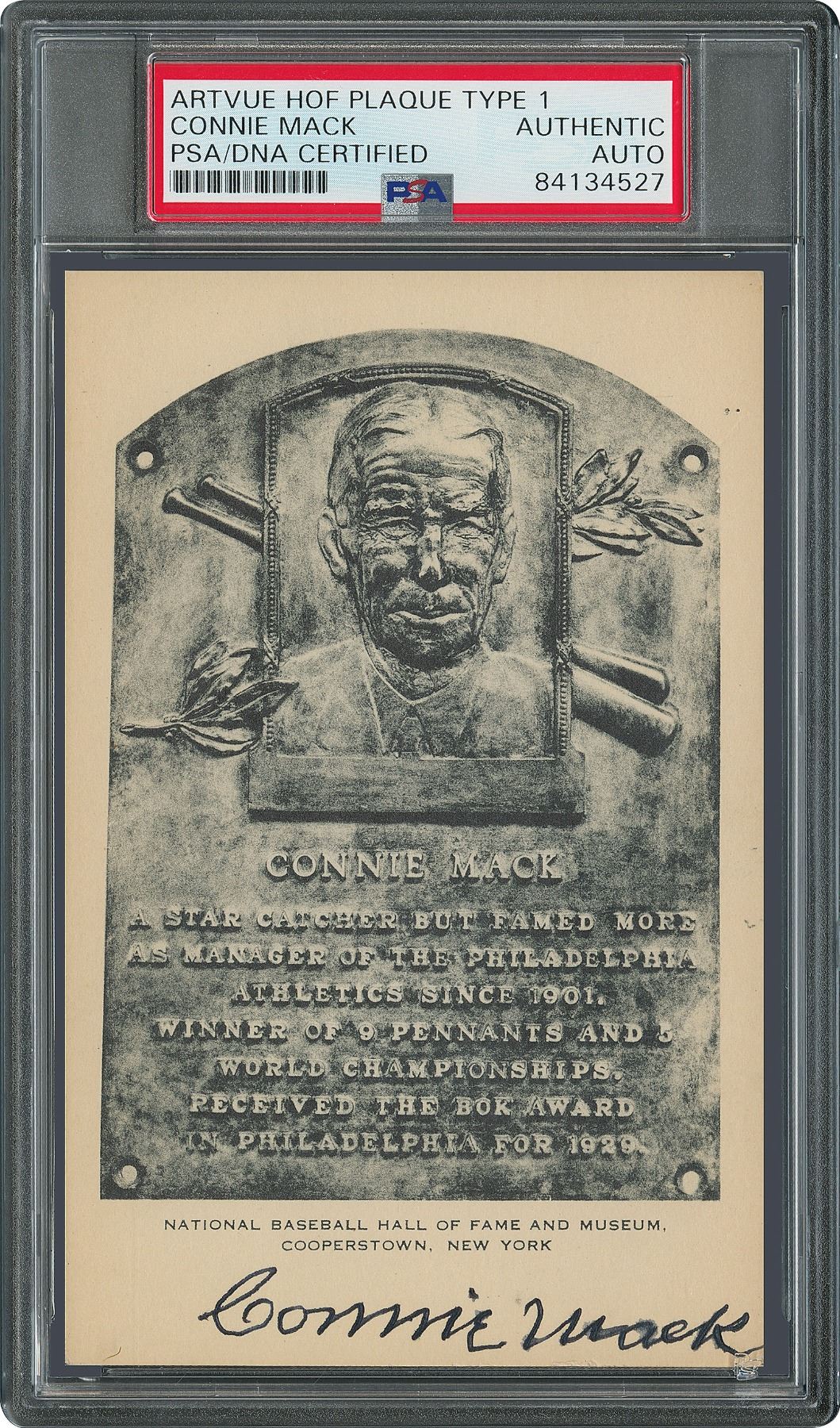 Scarce Artvue Type I black-and-white Hall of Fame plaque card, boldly signed in the lower border in fountain pen, "Connie Mack." In fine condition, with slight bleeding to ink in his surname. Encapsulated in a PSA/DNA authentication holder.