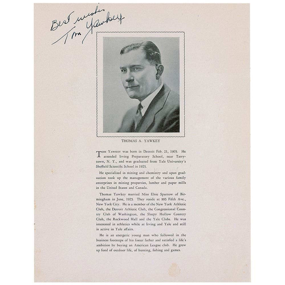 Program from a testimonial dinner to Thomas Yawkey and Eddie Collins, held at the Copley Plaza Hotel in Boston on May 2, 1934, 8.5 x 11.25. Signed inside in fountain pen by Connie Mack and Tom Yawkey, and signed in pencil by Eddie Collins. Some scattered light creasing and soiling, and expected handling wear, otherwise fine condition.
