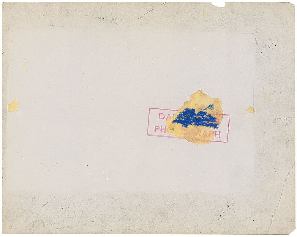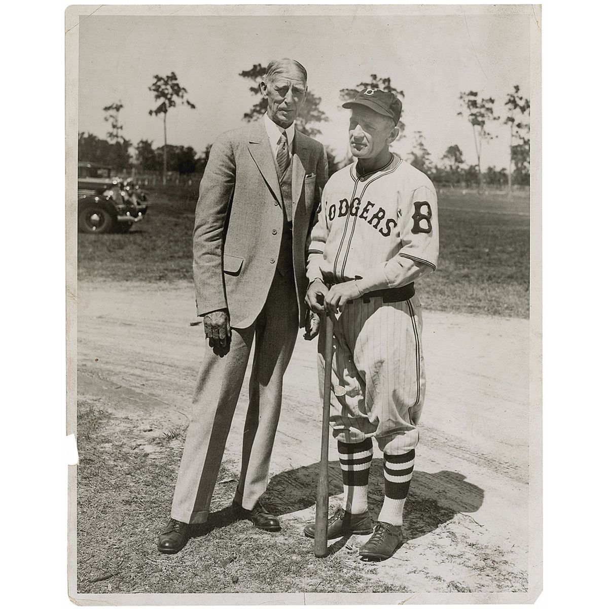 Vintage 8 x 10 gelatin silver photo of baseball Hall of Famers Connie Mack and Casey Stengel with photographer’s stamp on back. Some wear including a tear, edge chips, paper residue on back.