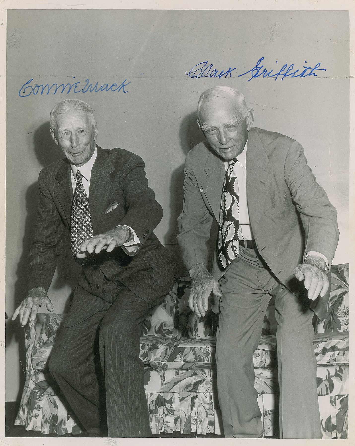 Humorous vintage glossy 8 x 10 photo of the two Hall of Fame owners lowering themselves on a sofa, signed in blue ink by Connie Mack and Clark Griffith. In very good condition, with scattered creases and bends. An uncommon dual-signed photo of the two legendary ball players-turned-managers-turned-owners.