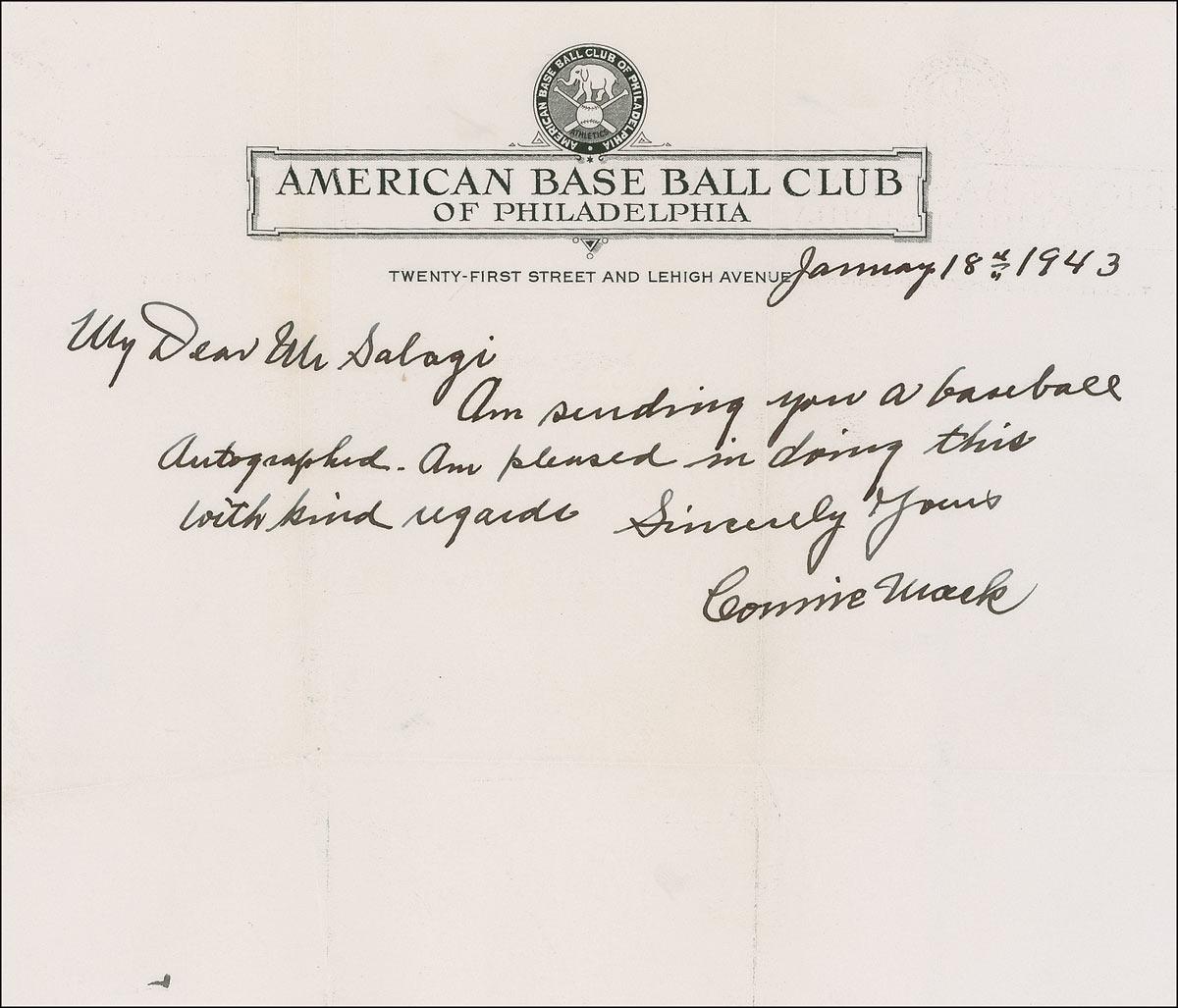 ALS, one page, 8.5 x 7, American Base Ball Club of Philadelphia letterhead, January 18, 1943. Short letter to a collector. In full: “Am sending you a baseball autographed. Am pleased in doing this with kind regards.” In fine condition, with intersecting folds, one through a single letter of signature, and a couple of minor creases. Accompanied by the original mailing envelope addressed by Mack.