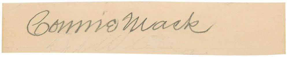 Vintage pencil signature, “Connie Mack,” on an off-white 4.25 x .75 clipped slip. In fine condition, with a bit of scattered light soiling and remnants of an erased name under signature.