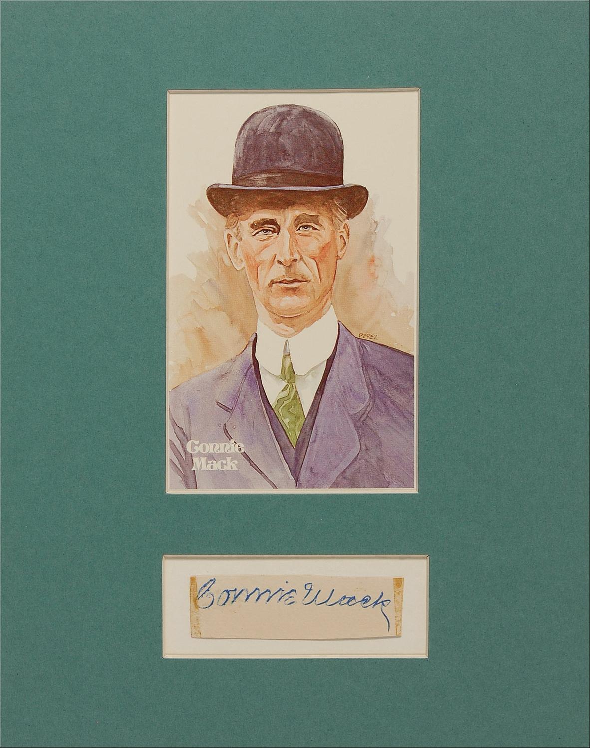 Ballpoint signature, “Connie Mack,” on an off-white 2.75 x 1 slip. Matted with a Perez-Steele card to an overall size of 8 x 10. Irregularly trimmed edges, adhesive staining at the left and right edges, and some irregular ink flow to his signature, otherwise fine condition.