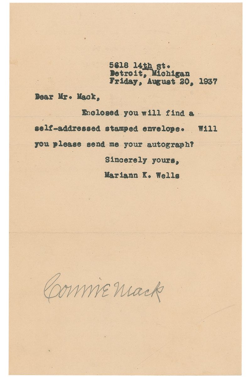 Vintage pencil signature at the conclusion of an off-white 5 x 8 sheet, on which an admirer typed a letter requesting Mack’s signature, dated August 20, 1937. In fine condition, with a bit of light creasing. Accompanied by the original mailing envelope.