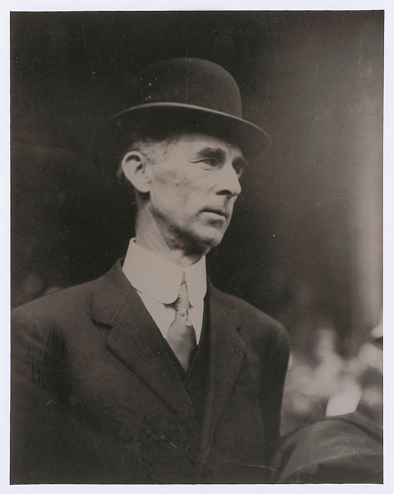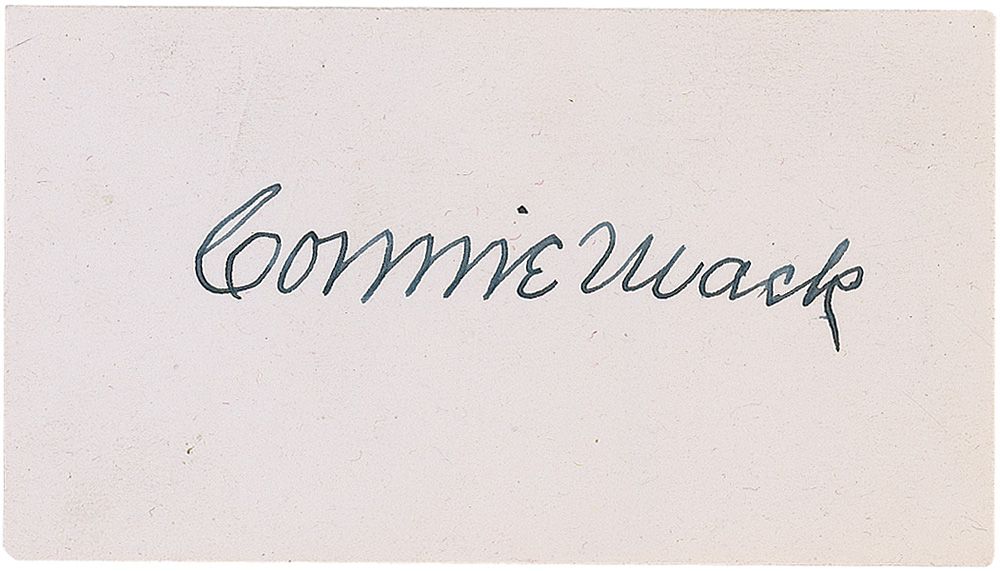 Vintage fountain pen signature, “Connie Mack,” on an off-white 3.5 x 2 card. In fine condition, with a paperclip impression through the “C.” Accompanied by the original mailing envelope and an unsigned satin-finish 8 x 10 photo of Mack in a suit and tie.