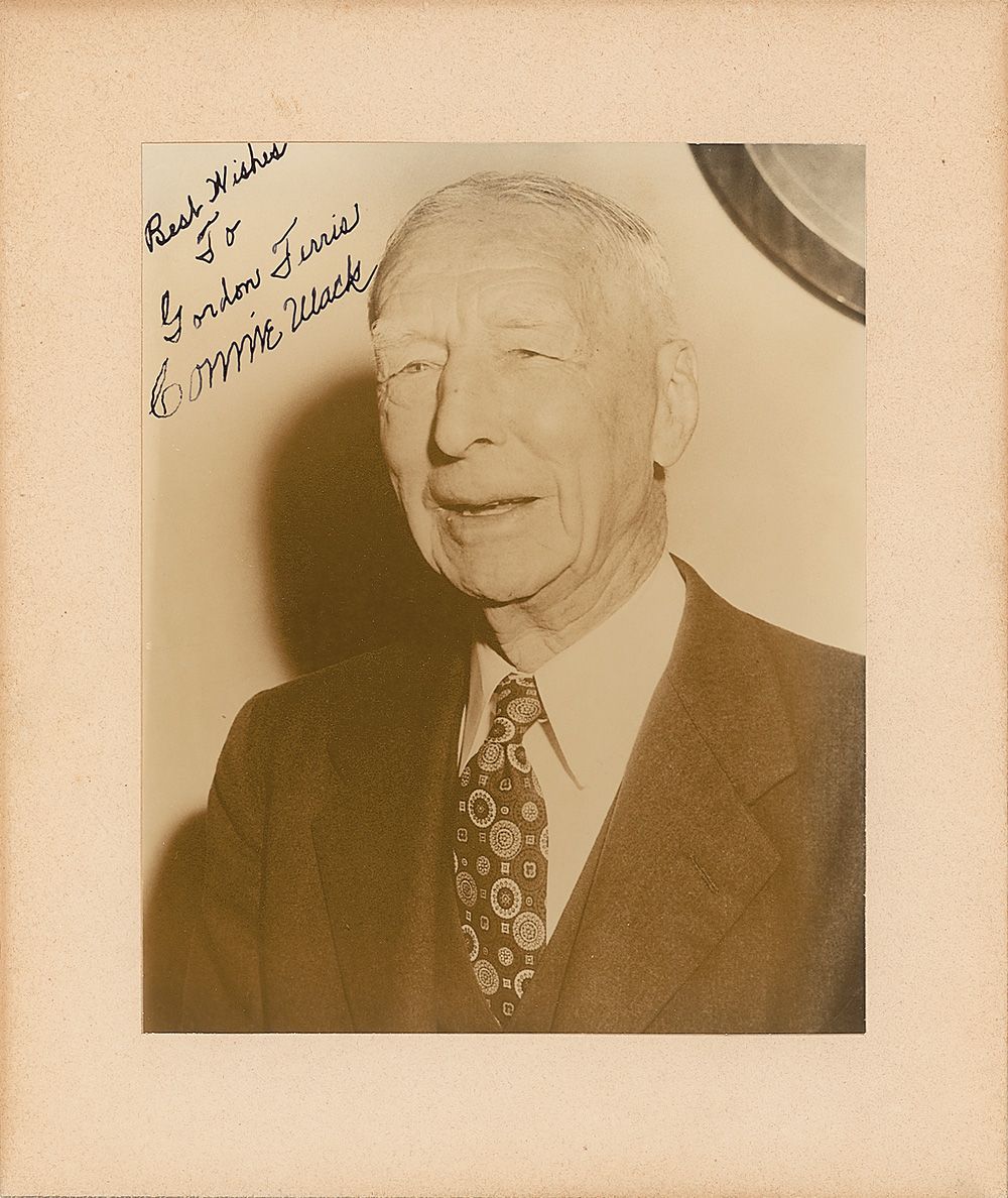 Once a catcher, but made his mark as a manager. After a stint at the helm of Pittsburgh, he assumed control of the Philadelphia Athletics in 1901 and continued for 50 years until retirement at the age of 88. Mack is best remembered as a dignified, scorecard-waving leader in a business suit, who won five World Series crowns and built two dynasties. Very nice vintage glossy 7.5 x 9 photo, affixed to a 10.5 x 12.5 mount, signed and inscribed in fountain pen “Best wishes to Gordon Ferris, Connie Mack.” In fine condition, with scattered light crazing to finish and a bit of irregular ink adhesion to beginning of signature. A boldly signed oversized example of the man who dedicated 50 years to America’s favorite pasttime.