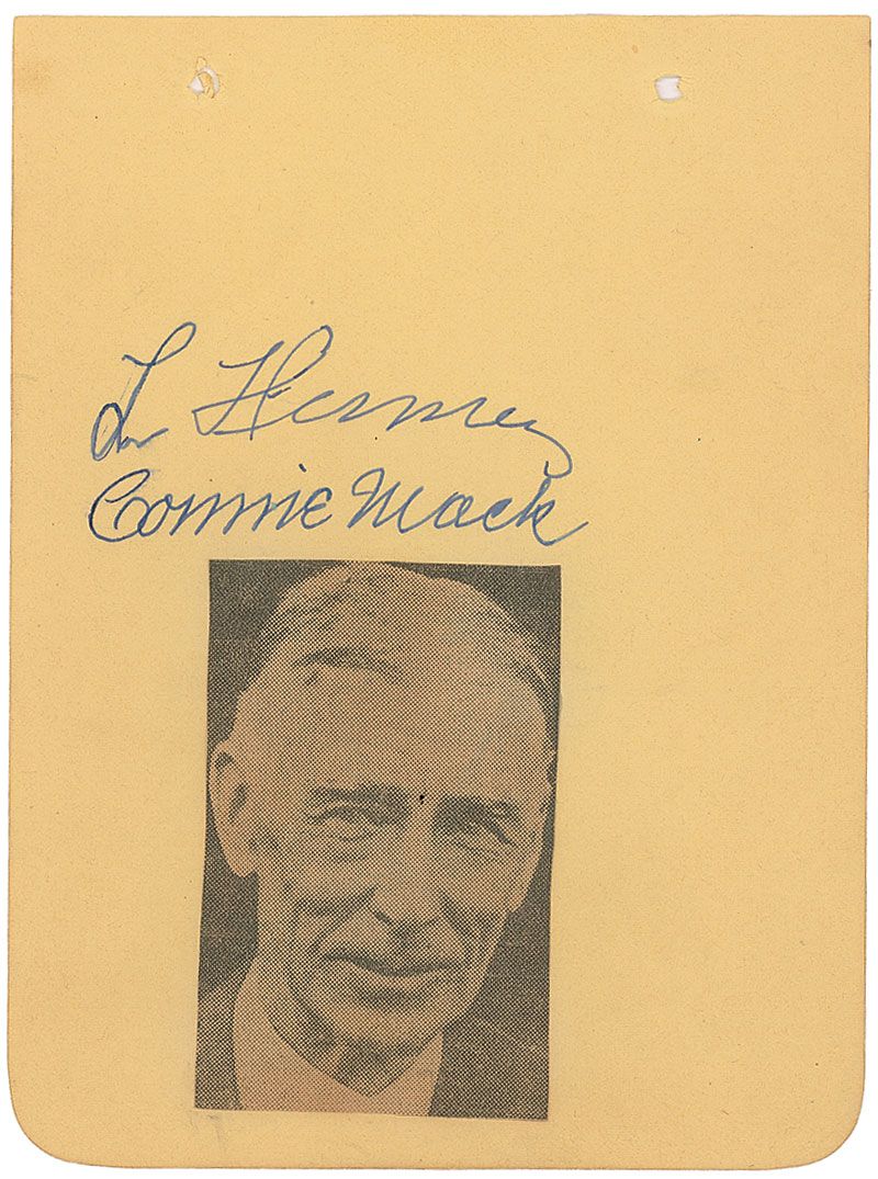 Legendary manager of the Philadelphia Athletics (1862–1956) inducted into the Baseball Hall of Fame in 1937. Vintage fountain pen signature, “Connie Mack,” on a yellow 4.5 x 6 album page bearing one other signature and an affixed newspaper photo of Mack. In fine condition.