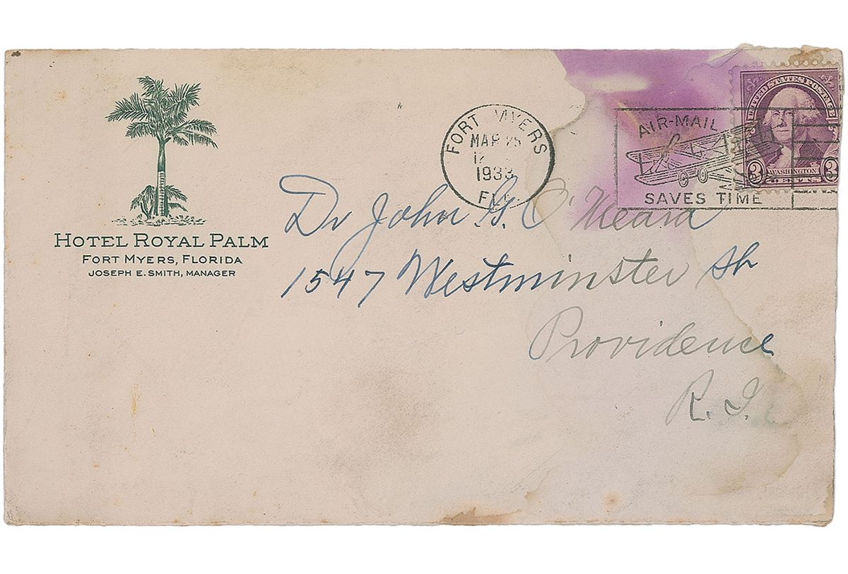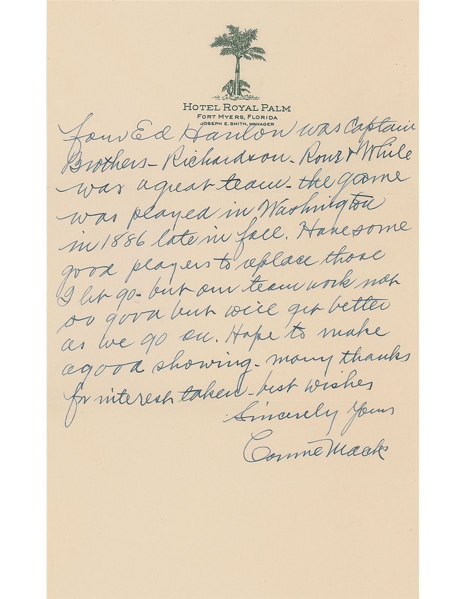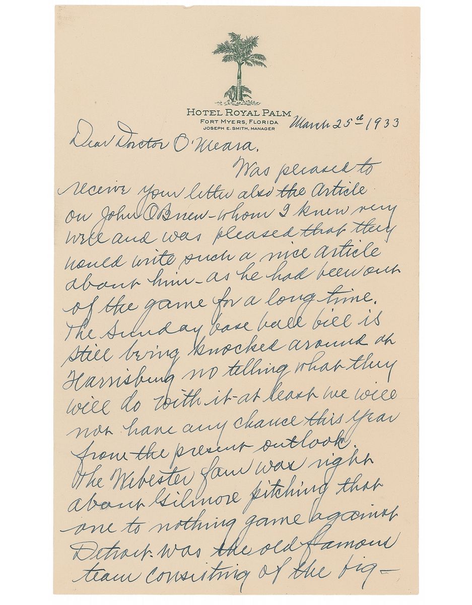 ALS, two pages, 5.75 x 9.25, Hotel Royal Palm letterhead, March 25, 1933. Letter to Dr. John O’Meara. In part: “Was pleased to receive your letter also the article on John O’Brien, whom I knew very well and was pleased that they would write such a nice article about him, as he had been out of the game for a long time. The Sunday baseball bill is still being knocked around at Harrisburg, no telling what they will do with it—at least we will not have any chance this year from the present outlook. The Webester four was right about Gilmore pitching that one to nothing game against Detroit, was the old famous team consisting of the big four: Ed Hanlon was captain, Brouthers, Richardson, Rowe & White was a great team. The game was played in Washington in 1886 late in fall. Have some good players to replace those I let go, but our team work not so good but will get better as we go on. Hope to make a good showing.” In fine condition. Accompanied by the original mailing envelope, addressed in Mack’s hand. Excellent content regarding the extremely early days of professional baseball, with Mack’s mention of the 1886 Detroit Wolverines club and their three Hall of Famers, Ned Hanlon, Dan Brouthers, and Deacon White. The 1886 season was Mack’s professional debut, and he went on to have a ten-year playing career; by the time he wrote this letter, however, he was starting his 33rd season as manager of the Philadelphia Athletics.