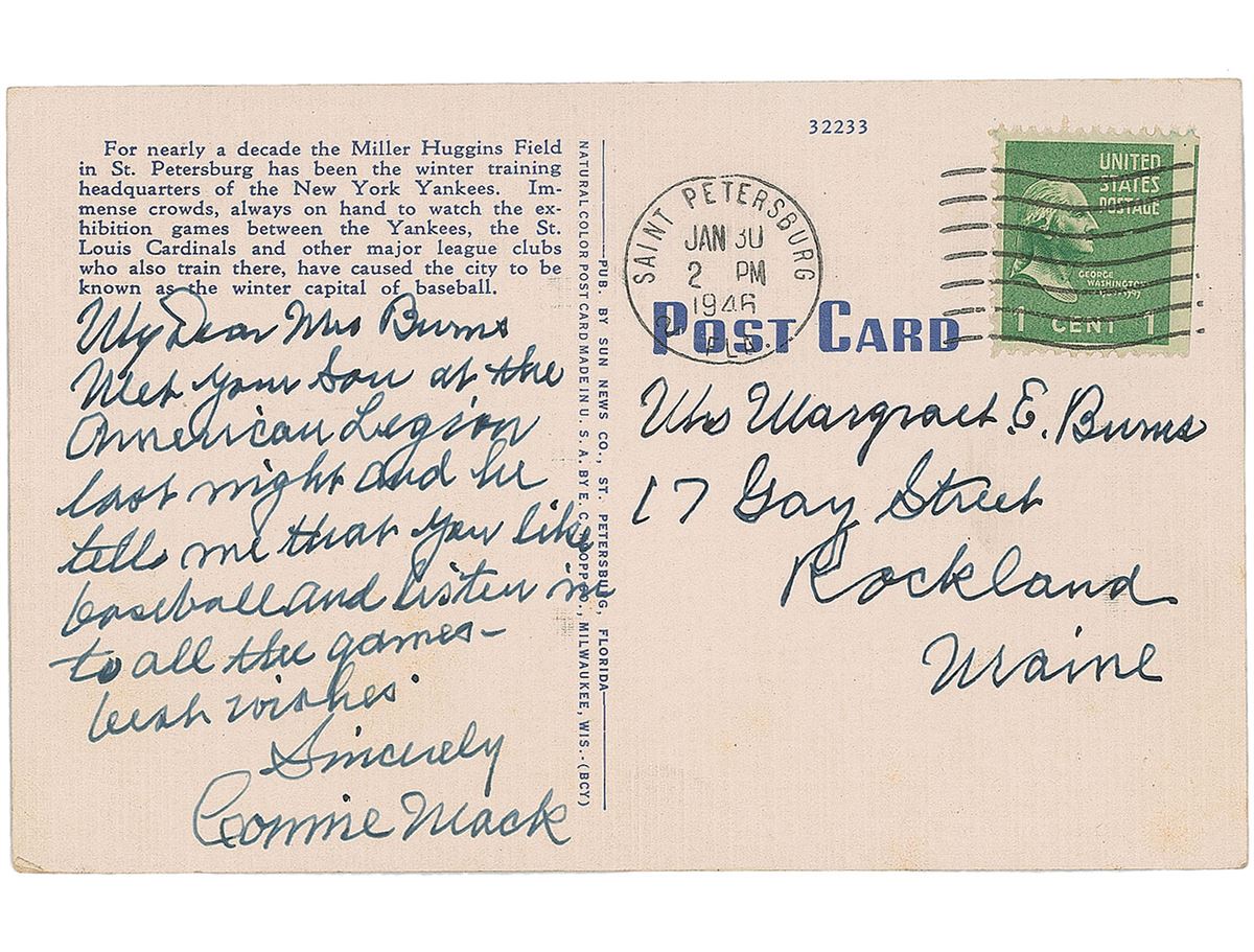 Two ALSs: the first, one page, Soreno Hotel letterhead, dated January 30, 1946, in full, “The postcard is on its way to your dear Mother—one who think[s] of his Mother never goes wrong—good luck to you”; and the second, the aforementioned postcard, postmarked January 30, 1946, in full, “Met your Son at the American Legion last night and he tells me that you like baseball and listen in to all the games—best wishes.” In overall fine condition, with intersecting folds (one vertical fold passing through a single letter of the signature) and a few light spots of discoloration to the first letter. Accompanied by the original mailing envelope, addressed in Mack’s hand.