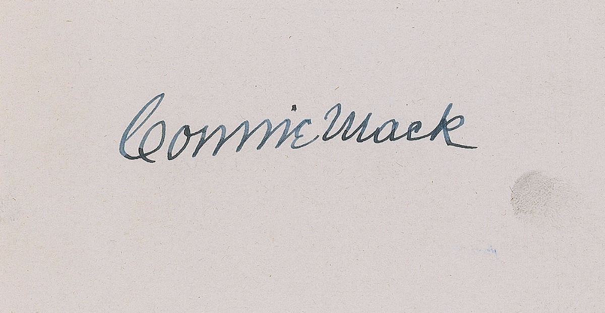 Fountain pen signature, “Connie Mack,” on an off-white 4.25 x 2.25 card. In fine condition, with slight soiling.