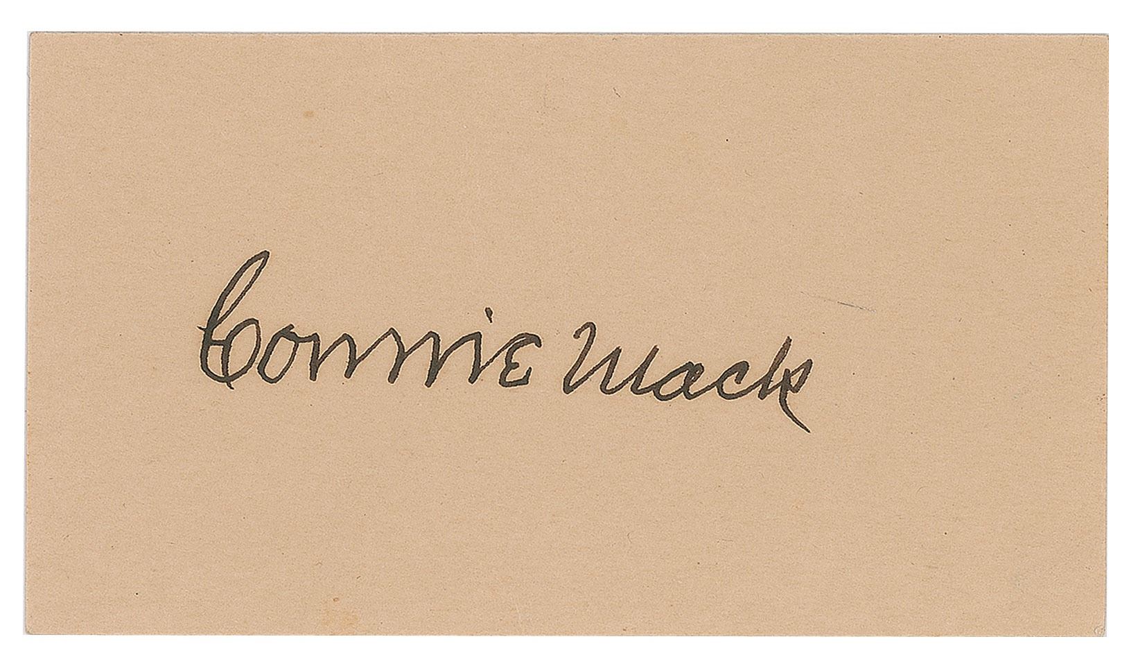 Bold vintage fountain pen signature, "Connie Mack,” on an off-white 3.75 x 2 card. In fine condition.