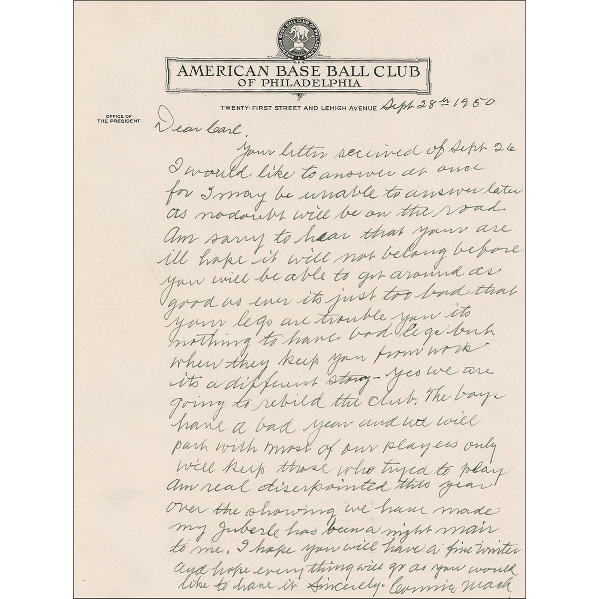 ALS, one page, 8.5 x 11, American Baseball Club of Philadelphia letterhead, September 28, 1950. Letter to a friend. In part: “Am sorry to hear that you are ill hope it will not belong [sic] before you will be able to get around…Yes we are going to rebuild the club. The boys had a bad year and we will part with most of our players only will keep those who tryed [sic] to play. Am real disappointed this year over the showing we have made. My juberle [sic] has been a nightmair [sic] to me.” In fine condition, with intersecting folds.