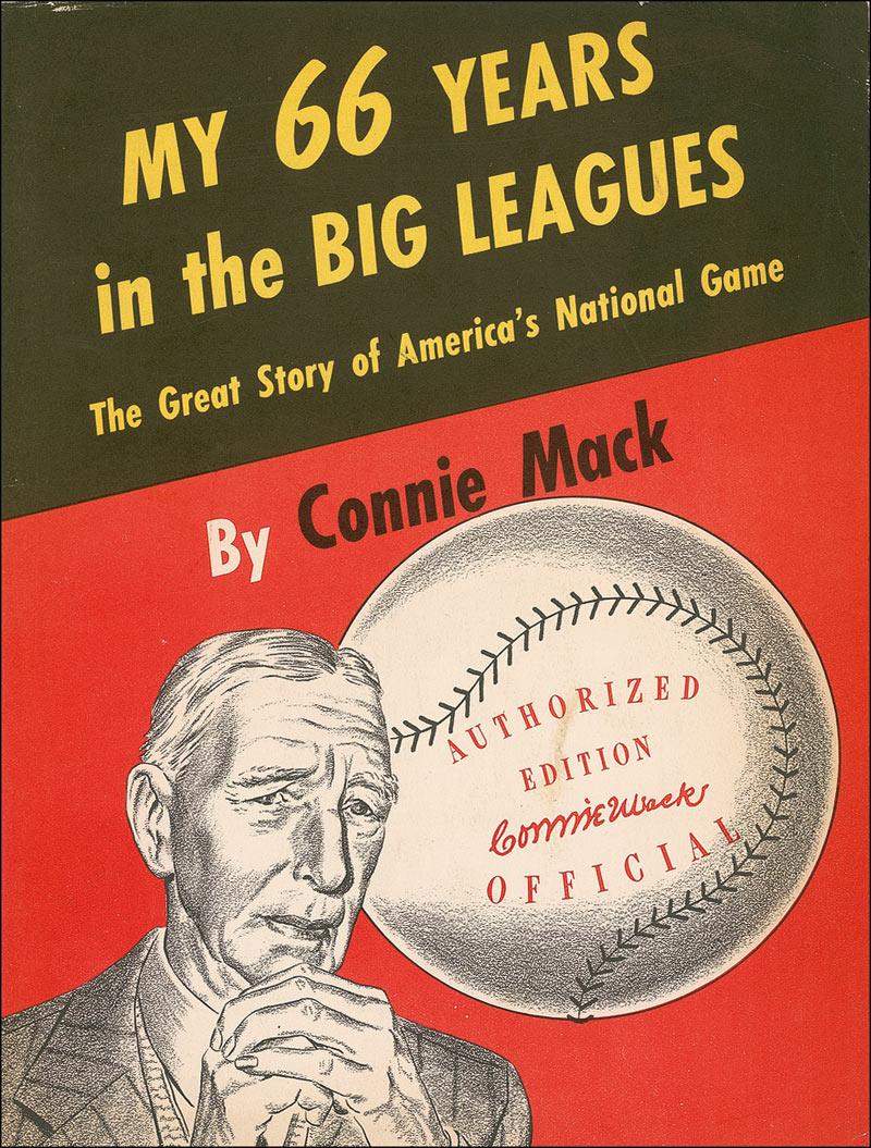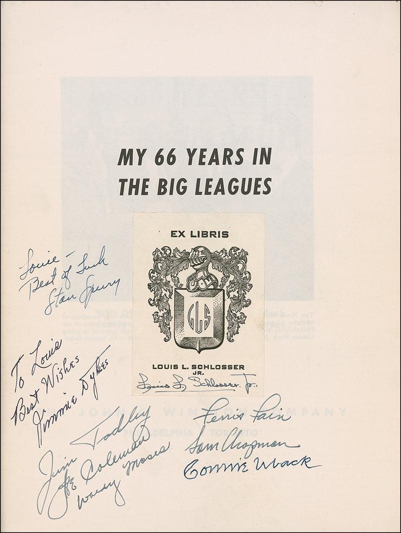 Signed booklet: My 66 Years in the Big Leagues. First edition, first printing. Philadelphia: The John C. Winston Company, 1950. Softcover, 8 x 10.75. Signed on the half-title page in fountain pen, “Connie Mack.” Also signed in fountain pen by Jimmie Dykes (ins), Sam Chapman, Ferris Fain, Joe Coleman, and three others. Small tear to the top edge of the signed page, a hint of toning, an owner’s bookplate affixed to the half-title page, and light creasing to the front cover, otherwise in fine condition.