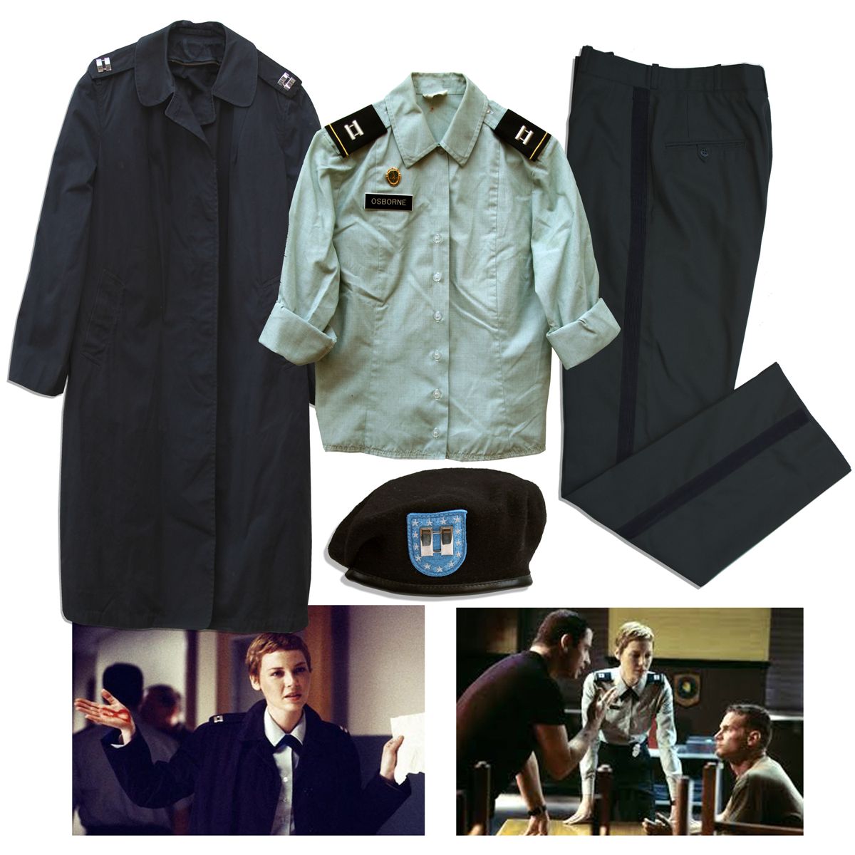 Connie Nielsen military costume from the 2003 thriller, ''Basic''. Nielsen played Captain Julia Osborne in the suspenseful film set in the jungles of Panama. Costume includes a traditional military Captain costume, including (1) a pair of Army-issued black pants, size 30R, with ''Osborne #2'' written to tag, (2) a light green button down shirt size 10R, with navy, white and gold patches sewn to each shoulder, as well as an Army pin and ''Osborne'' plastic name tag pin attached to shirt, (3) a black cotton polyester blend coat, size 16R, and (4) lastly, an army beret with a blue patch at center, size 6 and 7/8. Overall, near fine. With a Premiere Props COA.