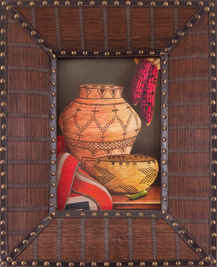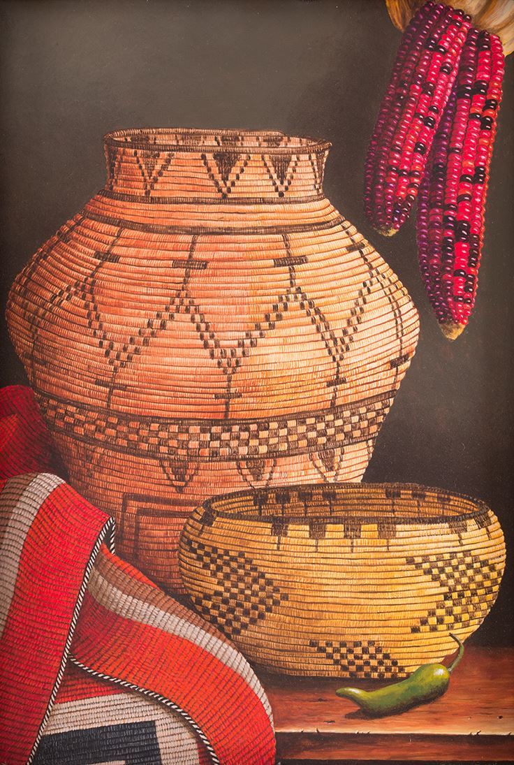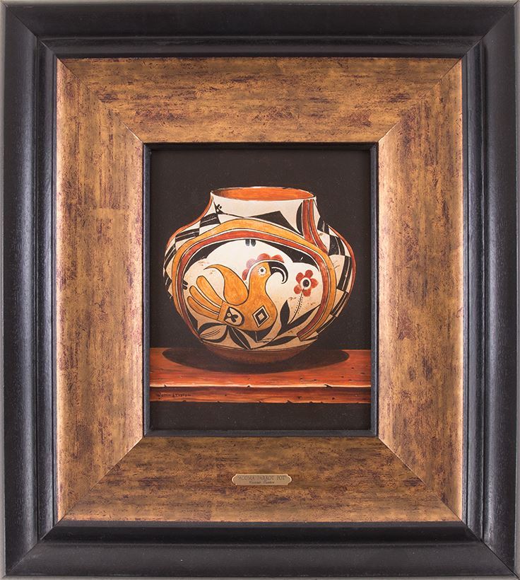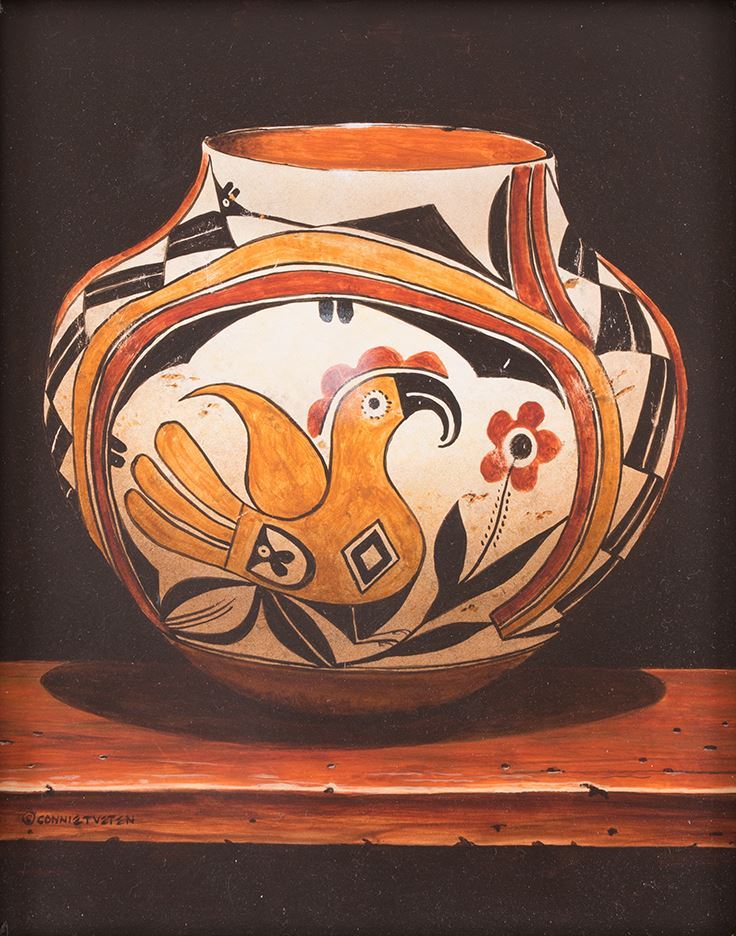 Connie Tveten (20th century). Two works. 1) Woven In Time. 11" x 16" acrylic. Signed lower right. Verso: Card stating subject, size, artist and title. ) Acoma Parrot Pot. 9 ½" x 7 ½" acrylic. Signed lower left.