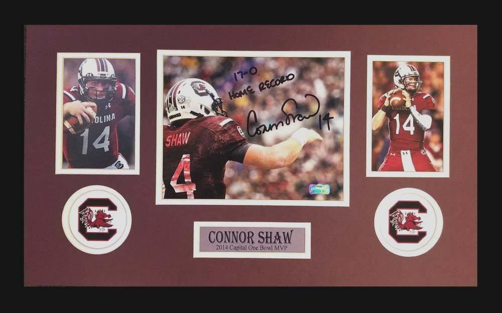 Custom framed display measures 16" x 26" in size and features a photo that has been hand-signed in black felt-tip pen by Connor Shaw (Browns).