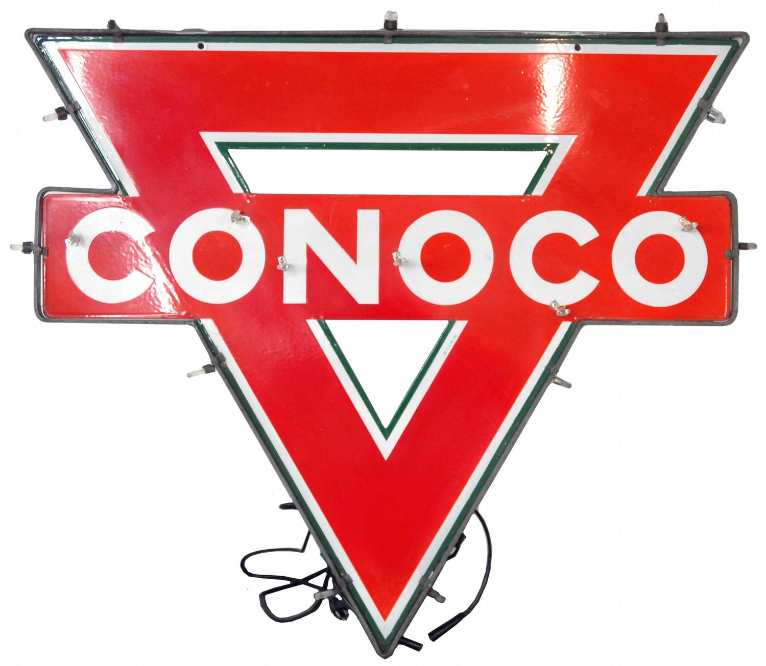 Conoco Double Sided Porcelain Neon Sign. One side has had some minor professional restoration and has the neon on it. The other side does not have any neon and has not had any restoration. 42 X 42 inches.