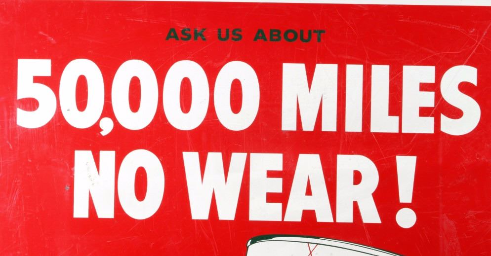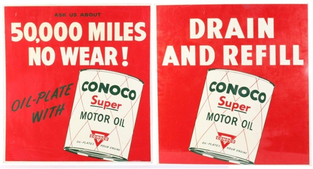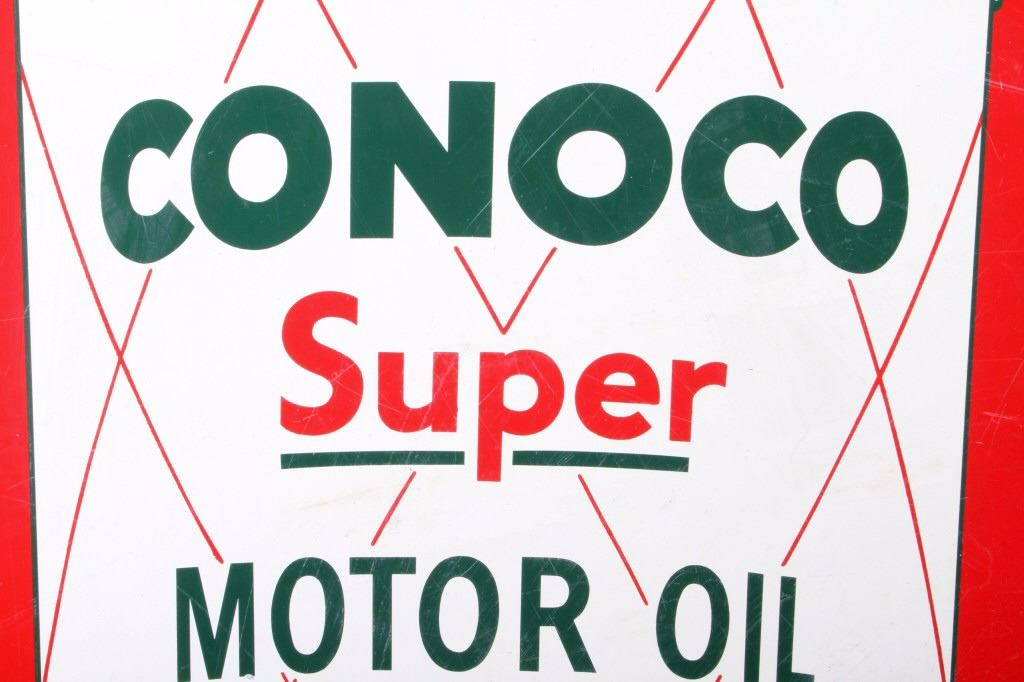 This is an original Conoco Super Motor Oil double sided rare sign from circa 1950. Both sides show an oil can with one side that reads "Ask Us About 50,000 Miles No Wear! Oil Plated With (on the oil can) Conoco Super Motor Oil - Conoco - Oil Plates Your Engine" and the other side reads "Drain and Refill (on the oil can) Conoco Super Motor Oil - Conoco - Oil Plates Your Engine". The Conoco Motor Oil sign is in good condition with bright, vivid colors and graphics. Bottom corner marked, "Robertson 7-50 Property of Continental Oil Co. Made in USA." The sign measures 31.5" x 36".