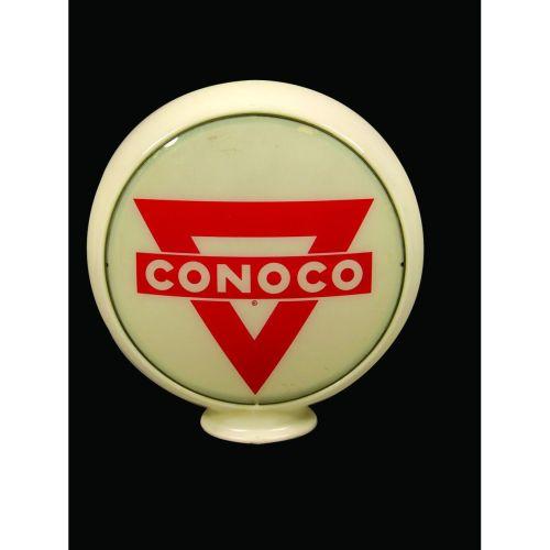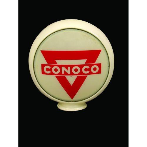 Conoco Gas Globe with milk glass snap ring, unusual size. Two glass inserts. No chips or cracks, excellent original condition. 14 inch diameter.