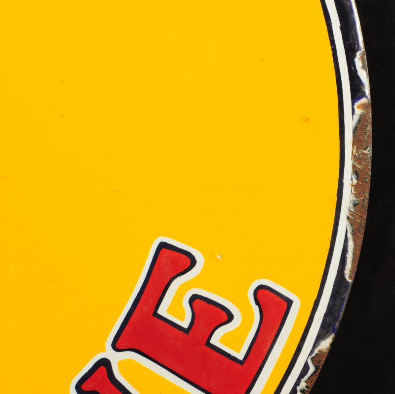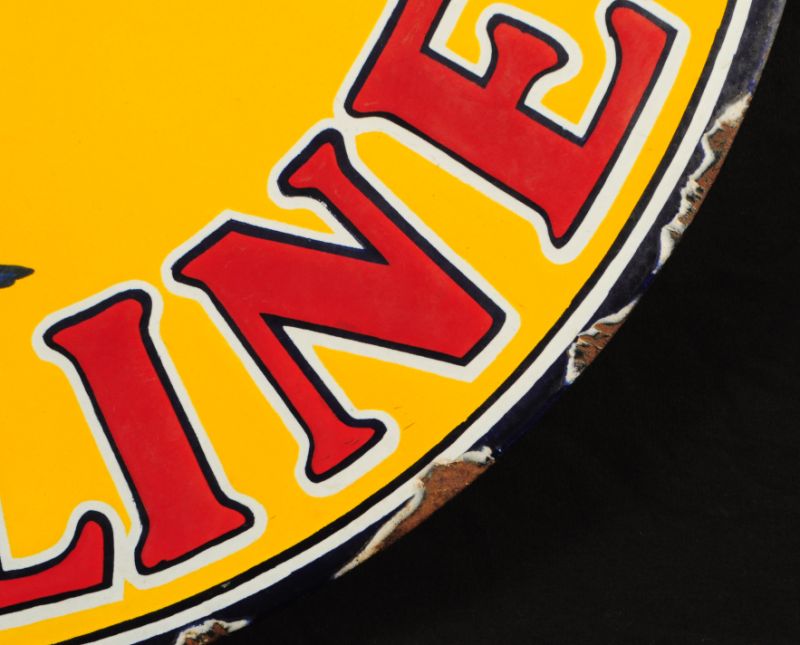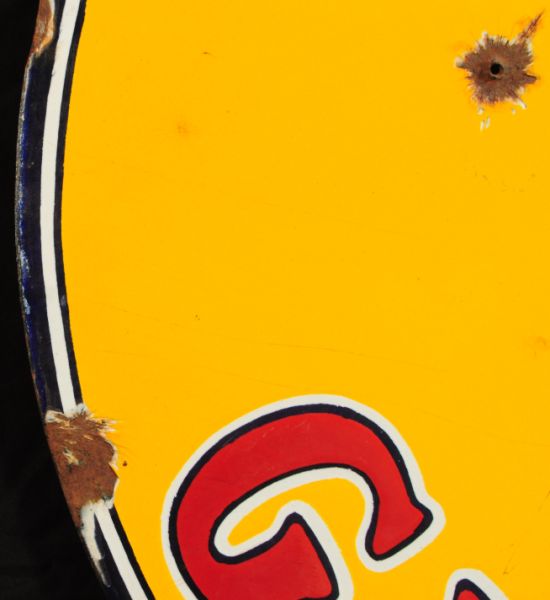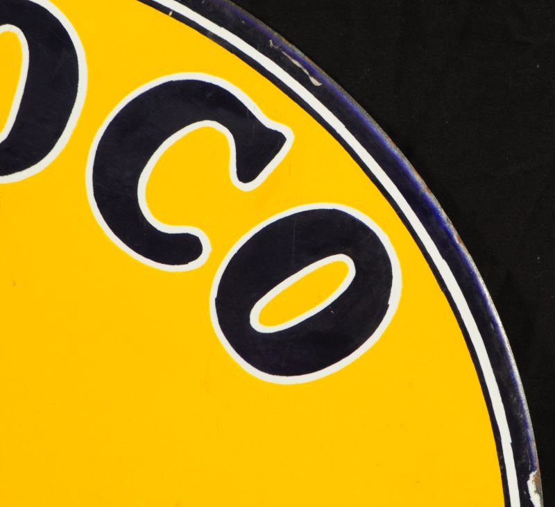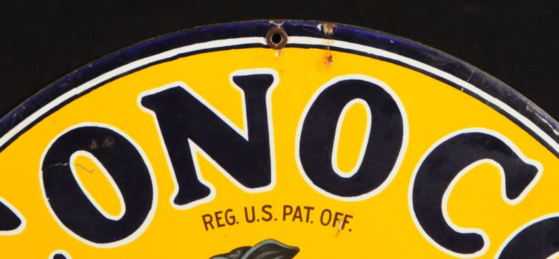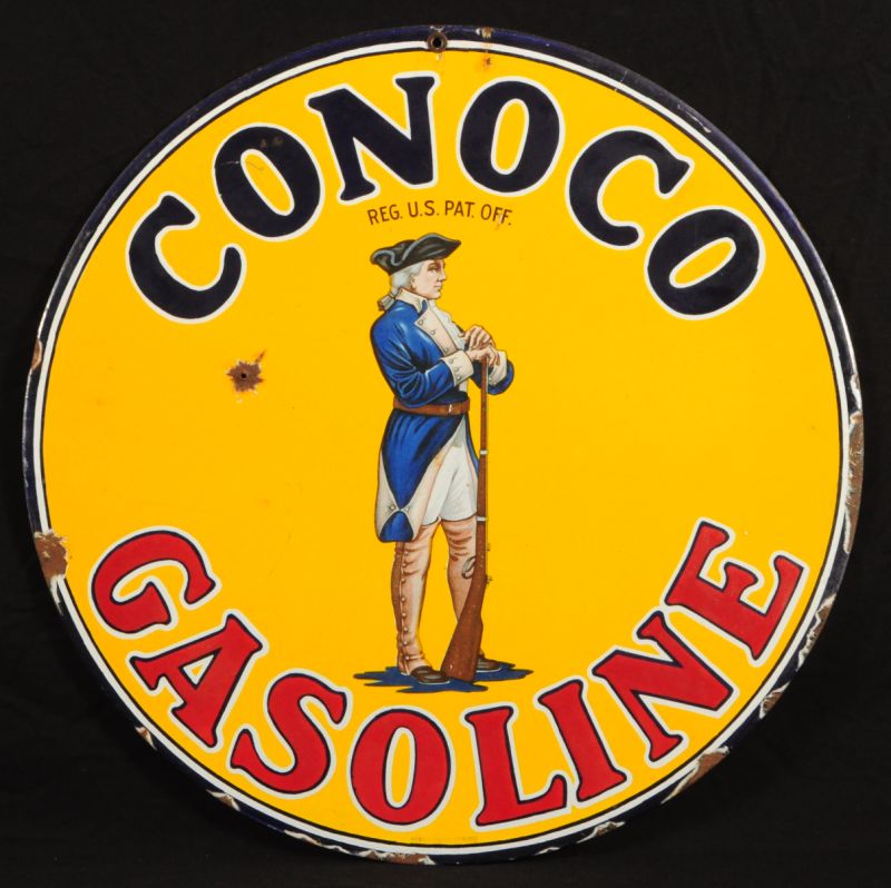 Conoco Gasoline Minuteman Porcelain Sign. Bright graphics, great colors. In good condition with a a few dings. One side being slightly better than the other. Measures 25.5" D.