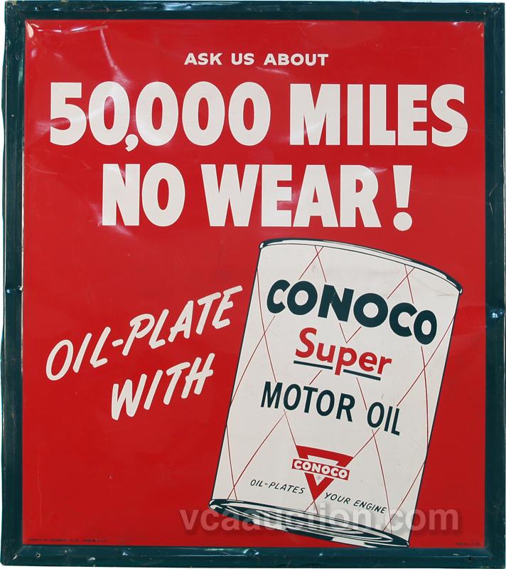 Conoco Motor Oil Self-Framed Tin Sign, "Ask About 50,000 Miles No Wear!" c1950 - 34" x 39"
