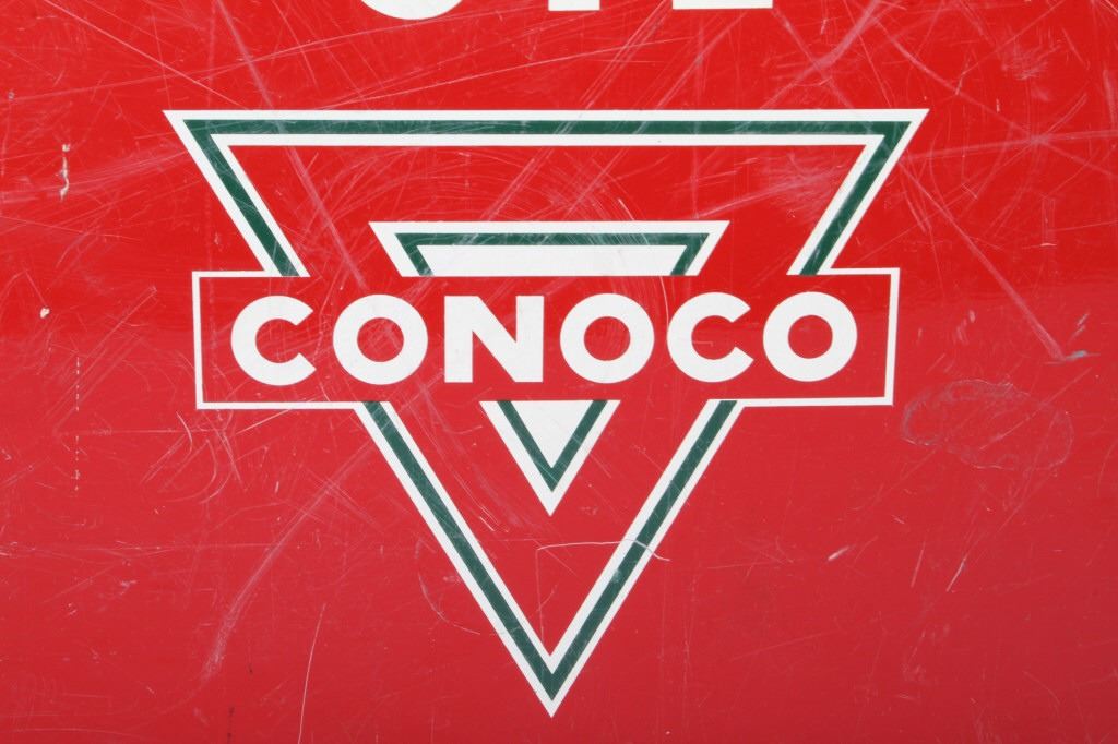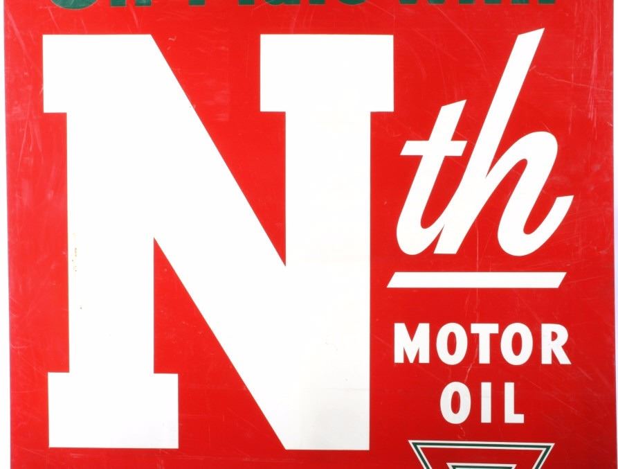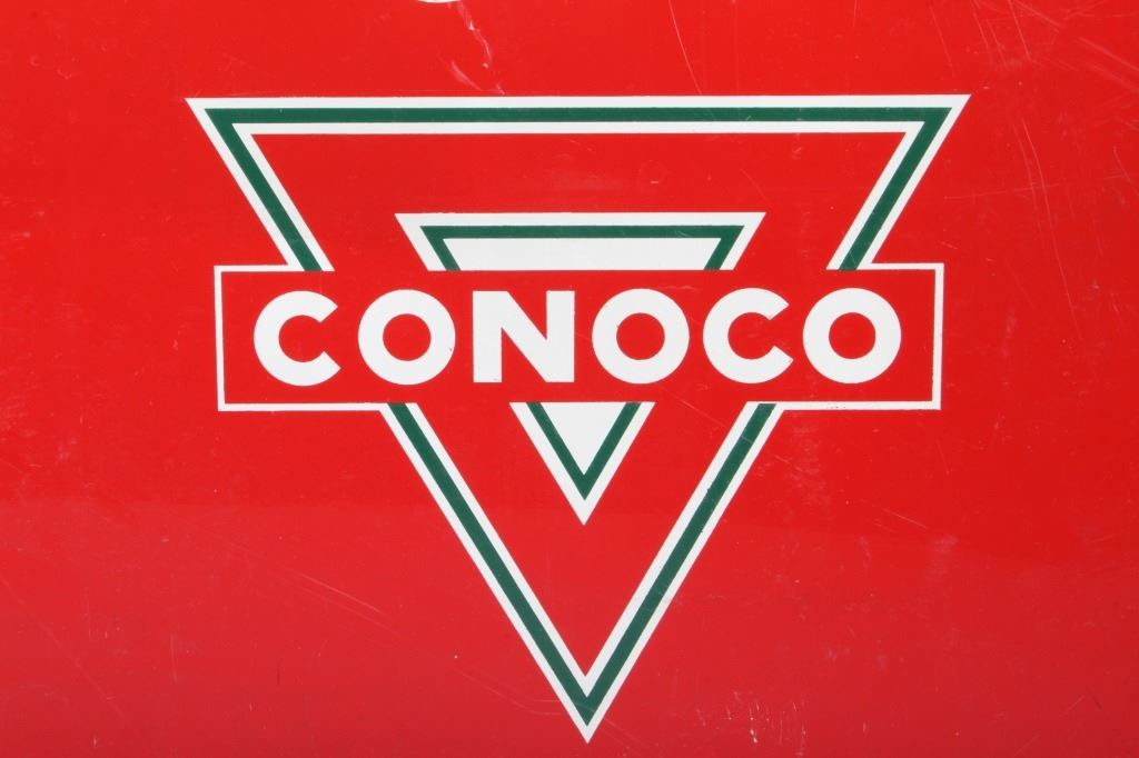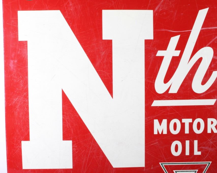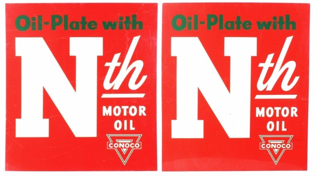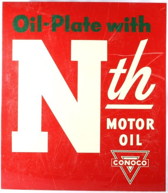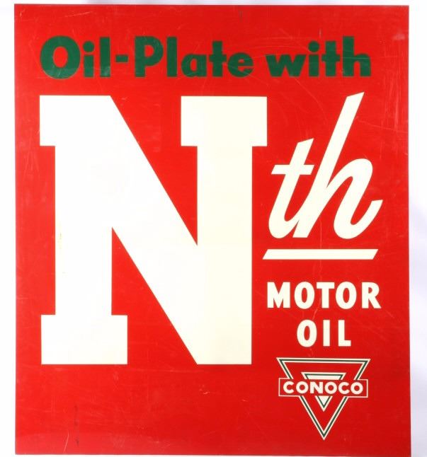 This is an original Conoco Nth Motor Oil double sided rare sign from circa 1940s'. The sign shows the same graphics on both sides and is in rare condition with only slight wear. The sign shows the slogan "Oil-Plate with Nth Motor Oil" and the Conoco logo. The sign is in good condition with bright, vivid graphics and colors. The sign measures 31.5" x 36".