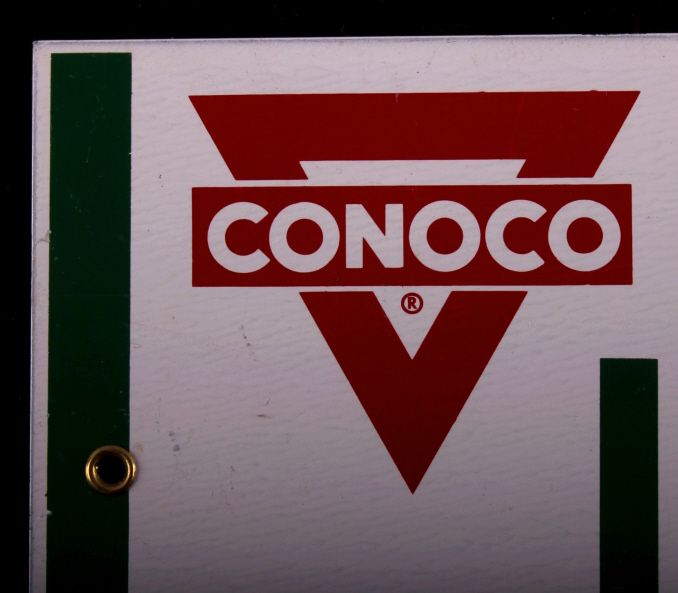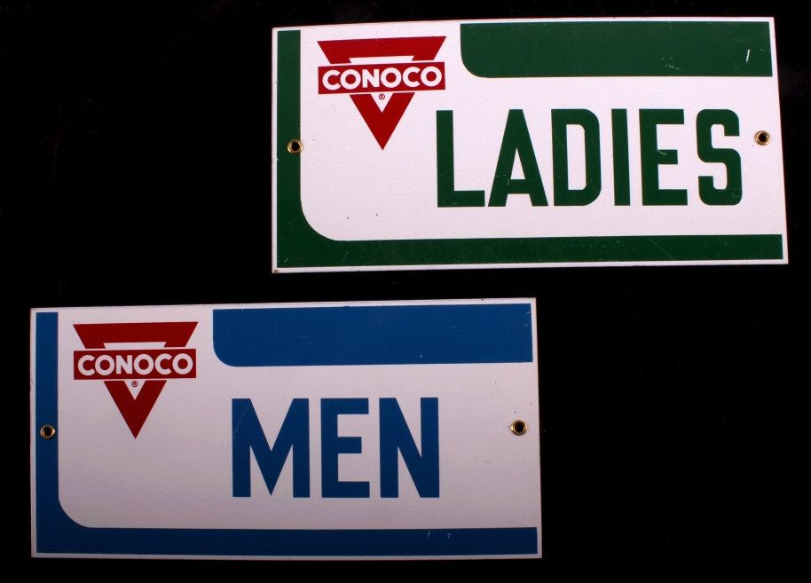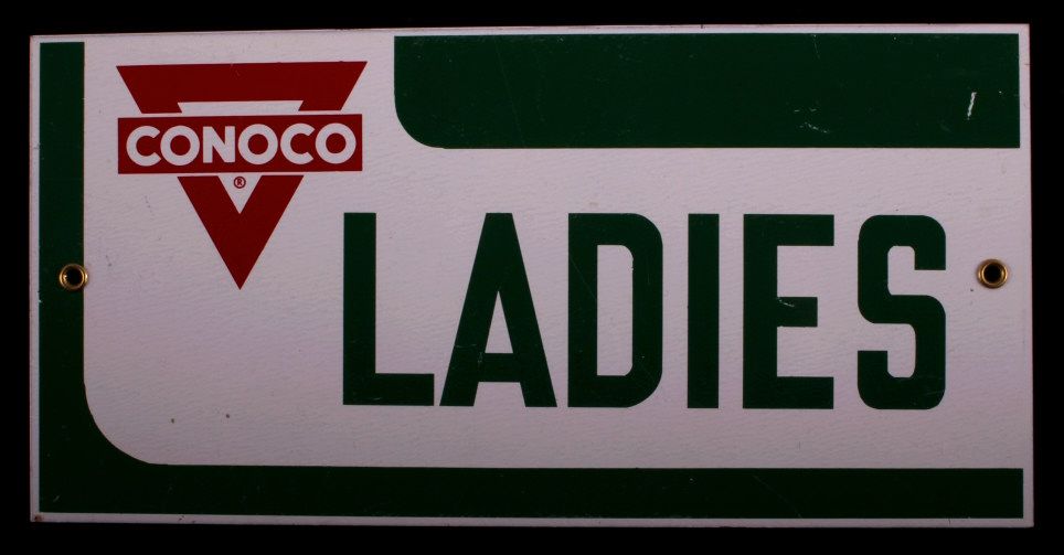This lot includes a pair of Conoco restroom signs. One sign reads "MEN" and the other reads "LADIES". These are original signs in very good condition. Each sign measures 5" x 10".