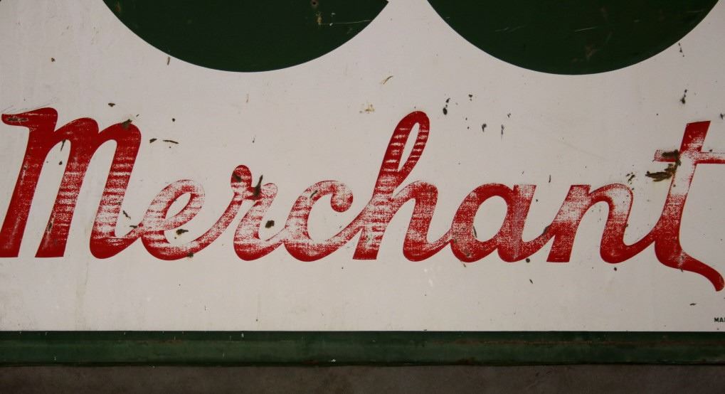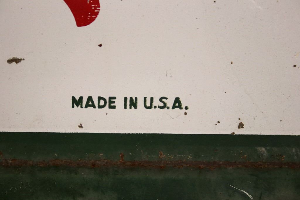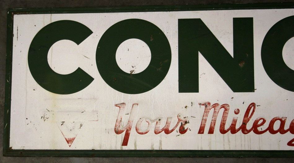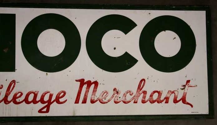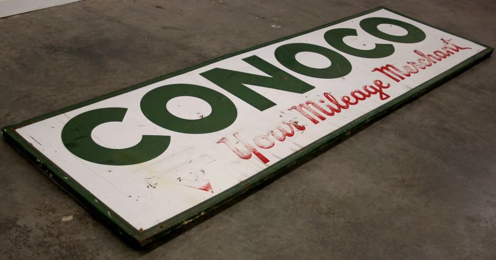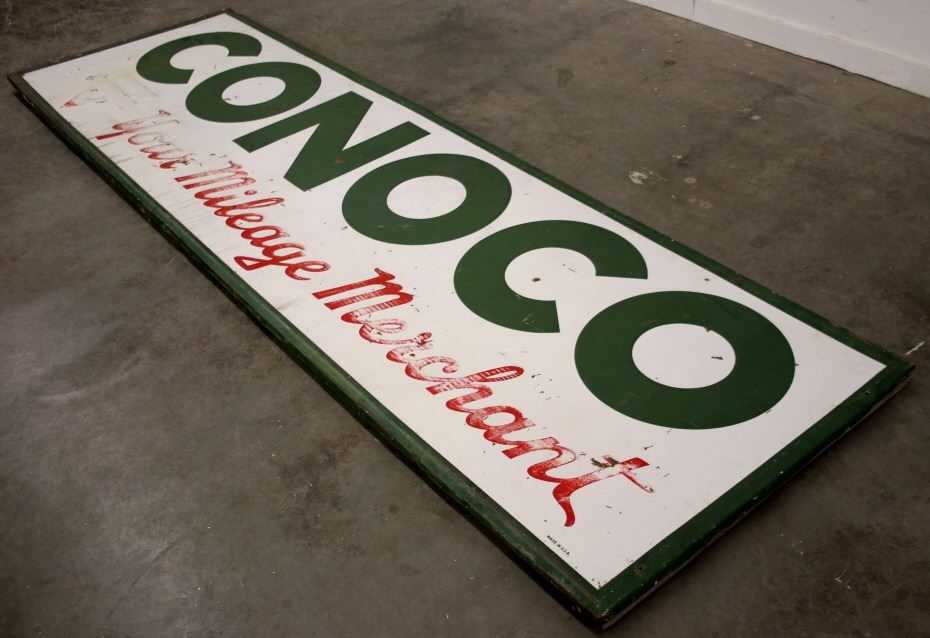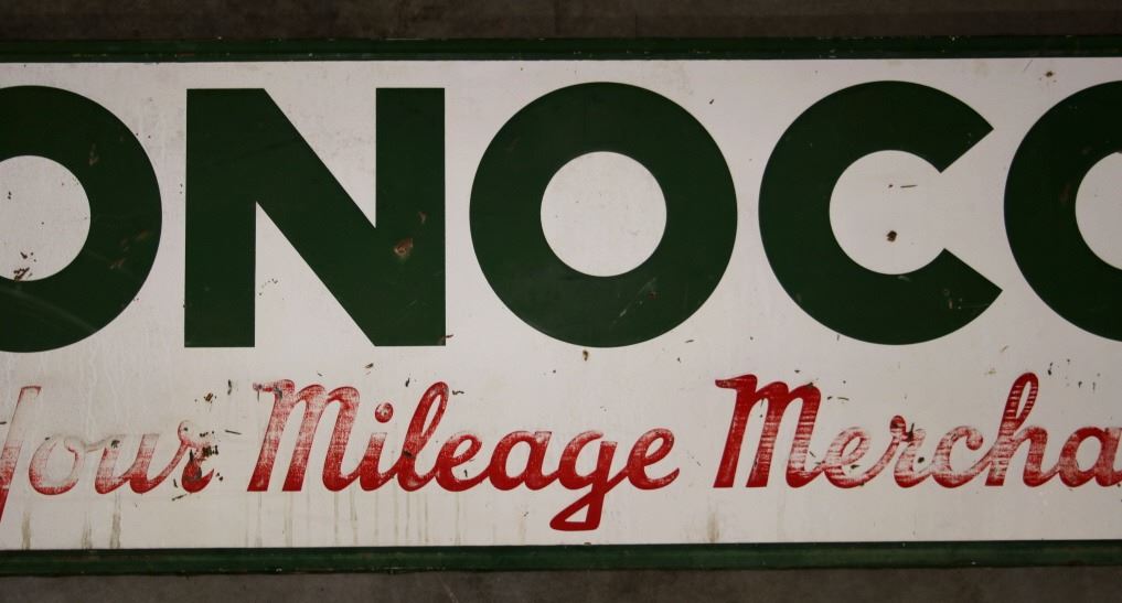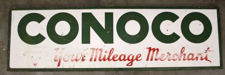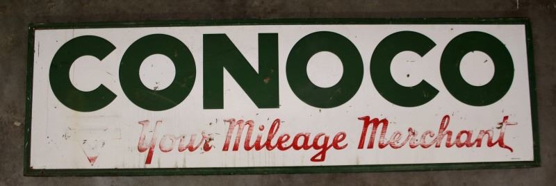 This is an original large Conoco service station tin advertising sign from Wilsall, Montana dating to circa 1947. The sign shows the early Conoco logo and reads "Conoco / Your Mileage Merchant". The sign was manufactured by Grace Sign Co. St. Louis. The sign has a wooden frame, also original. The Conoco advertising sign is in good overall condition. It measures 3' tall and 10' long.