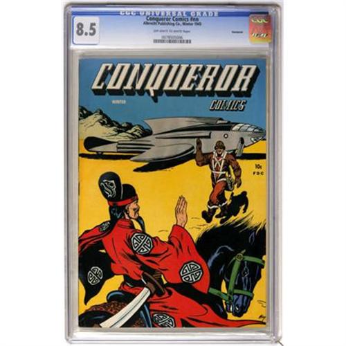 <B>Conqueror Comics #nn Vancouver pedigree (Albrecht Publishing, 1945) CGC VF+ 8.5 Off-white to white pages.</B></I> Overstreet 2007 VF 8.0 value = $118; VF/NM 9.0 value = $182. CGC census 6/07: 1 in 8.5, 1 higher.<BR><BR><b>Shipping:</b> Comics - Slabbed (certified) (<a target="_blank" href="http://www.heritageauctions.com/common/shipping.php">view shipping information</a>)