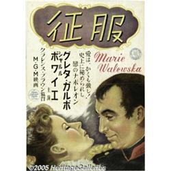 <B>Conquest (MGM, R-1947)</B></I> Japanese B3 (14" X 20"). Greta Garbo and Charles Boyer starred in this version of the historical romance between Napoleon and Polish countess Marie Walewska. Marie was coaxed by the politicians of Poland to use her charms to convince Napoleon to give the country some independence. The poster gives the U.S. title as "Marie Walewska" which was the films original work title. When the film was finally released in the U.S., the title was changed to "Conquest". This poster was released between 1947 and 1948, the first two years of the MPEA (Motion Picture Export Association). The MPEA was set up in 1946 after the end of the war, to help spread the release of American made movies in occupied Japan, both new releases and movies that had not been released before the war. This is the first Japanese release for this movie. It printed in the slightly smaller size B3 format still due to wartime paper rationing which was not lifted until the early 1950s. The poster exhibits lots of foxing throughout and was folded in half at one time. Fine.