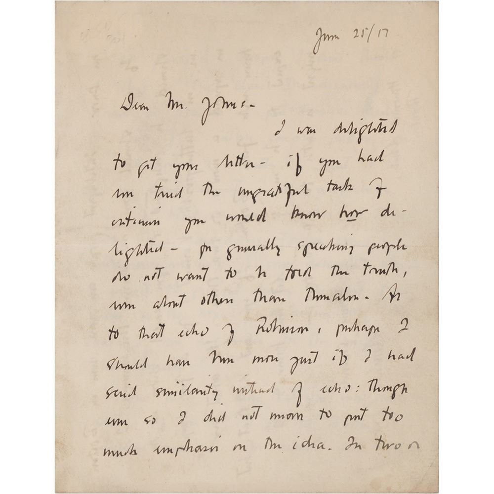 Pulitzer Prize–winning American poet, novelist, and writer of short stories (1889–1973). ALS, four pages on two adjoining sheets, 5 x 6.25, June 25, 1917. Handwritten letter to American poet Orrick Johns, responding to a comparison of his 1916 book of poetry, The Jig of Forslin: A Symphony, to the writing of Charles Baudelaire. In part: "I was delighted to get your letter…As to that echo of Robinson, perhaps I should have said more just if I had said similarity without…echo: though even so I did not mean to put too much emphasis on the idea. In two or three of your things I felt something of Robinson's trick of veiled reference…coupled with traces of rhythm: certainly nothing to worry about!…I imagine that if I were drunk I should call him a Mining Puritan.