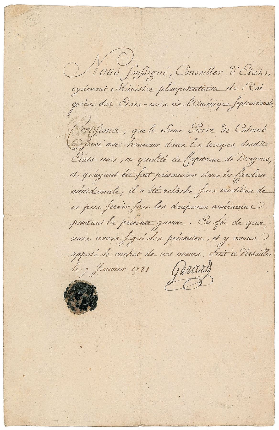 French politician (1729–1790) who was the country's first diplomatic representative to the United States. Revolutionary War-dated manuscript DS, in French, untranslated, signed “Gerard,” one page, 8 x 12.5, January 7, 1781. Signed as councilor of state, a document certifying the meritorious service of Captain Pierre Colomb during the American War of Independence, where he was taken prisoner in South Carolina by British forces and released with the provision that he no longer serve under the American flag. Original wax seal remains affixed to lower left. In fine condition.