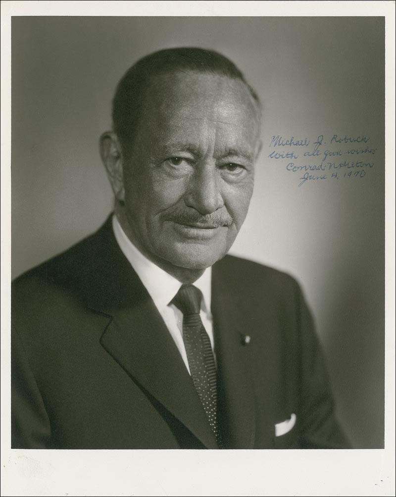 Founder and president of the Hilton Hotels Corporation (1887–1979). Matte-finish 8 x 10 photo, signed and inscribed in blue ballpoint “Michael J. Robuck, With all good wishes, Conrad Hilton, June 4, 1970.” In fine condition, with a couple small corner tip creases, and a bit of light soiling to lower border.
