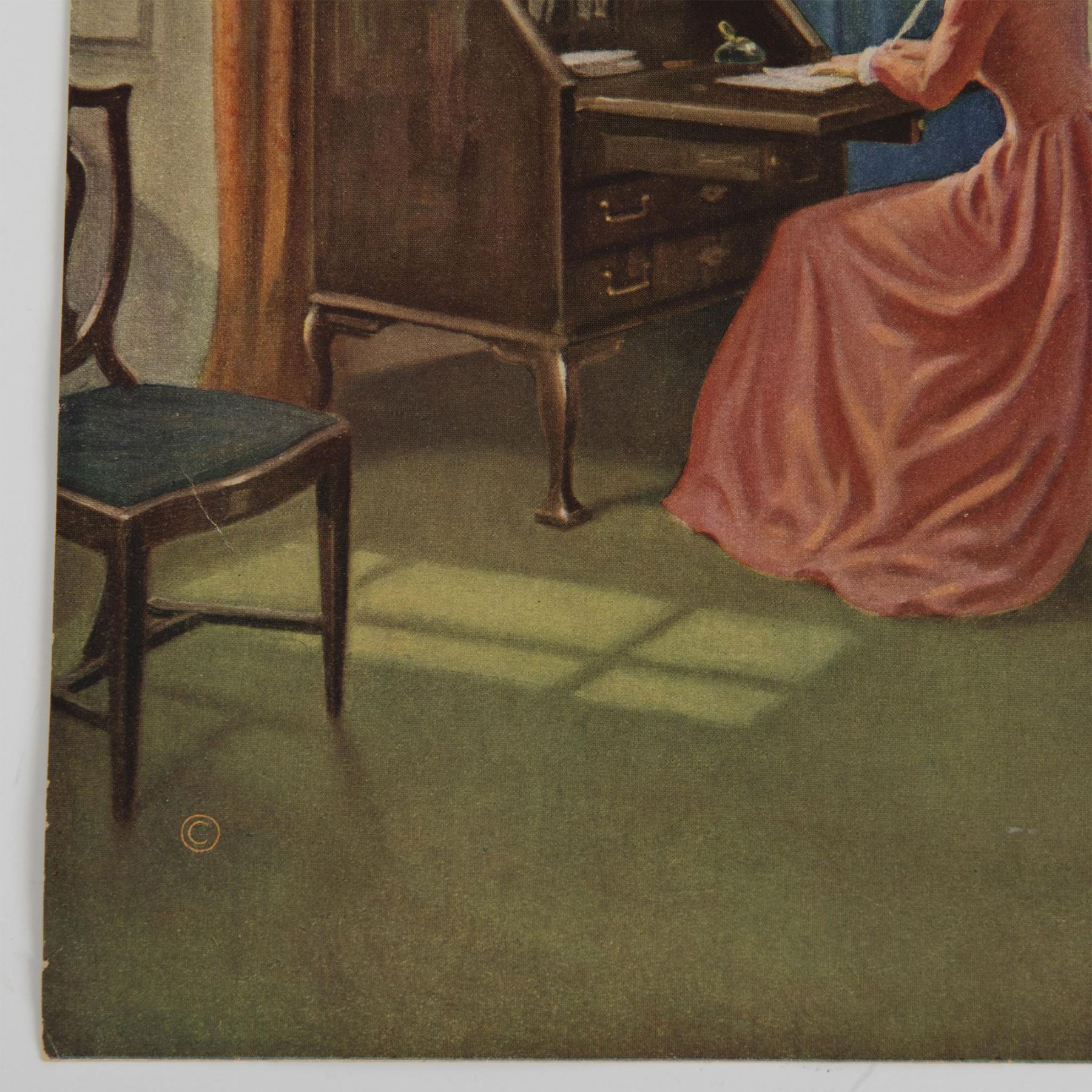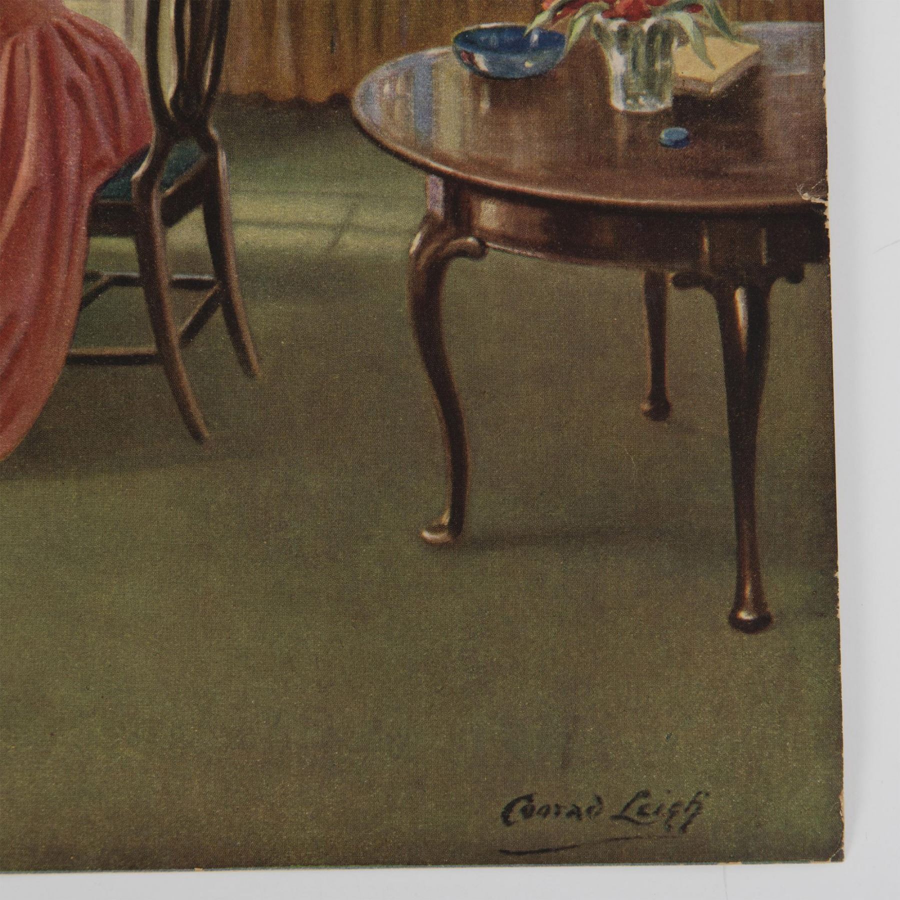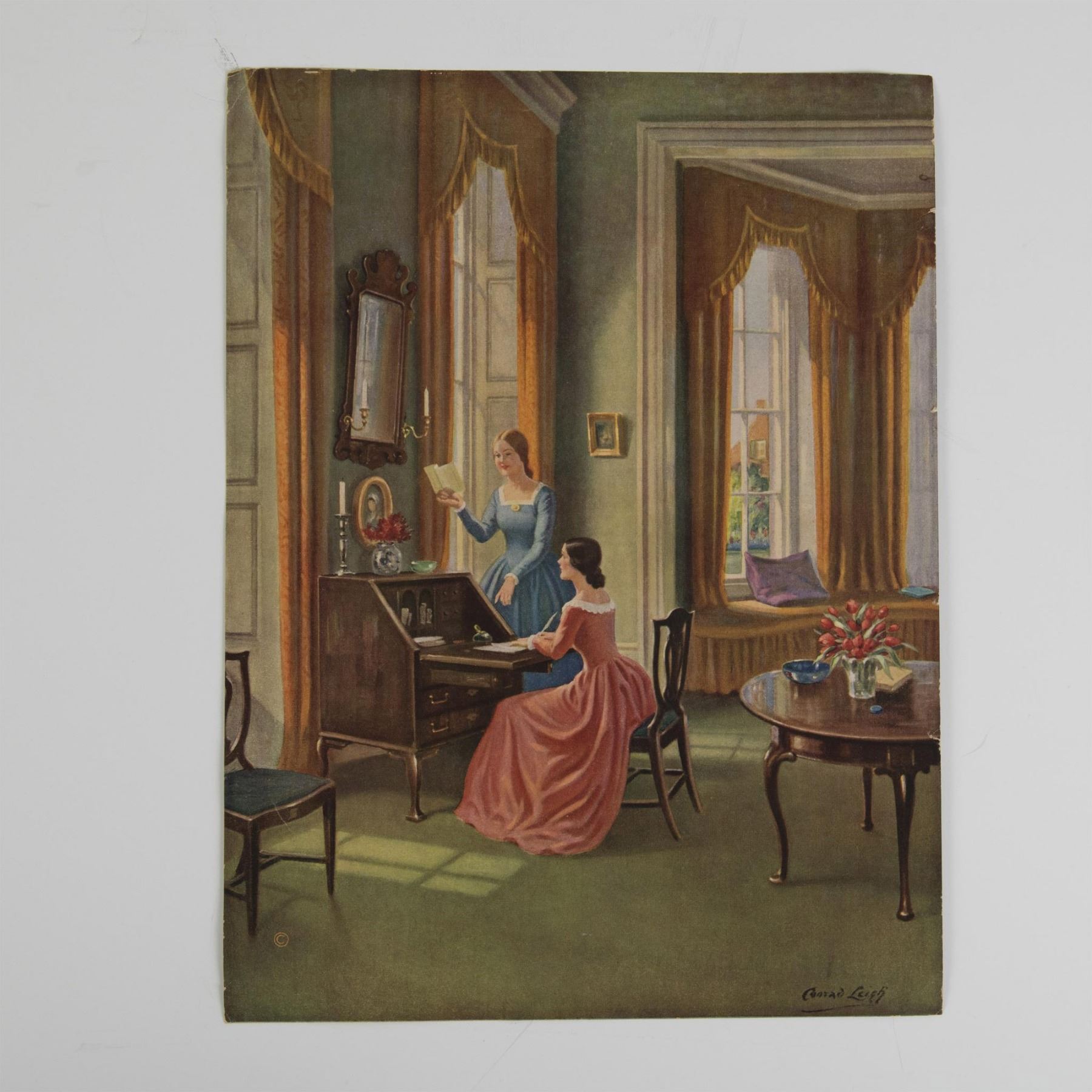 A color print on paper, after an original painting by Conrad Heighton Leigh, capturing a Victorian-era scene in which a woman writes a letter while another woman stands beside her. Signature on lower right.
