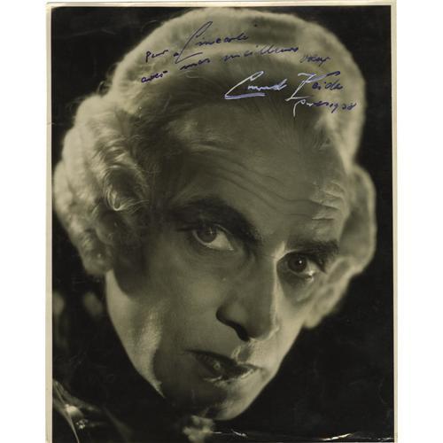 <B>Conrad Veidt and Paul Ivano Signed Portraits.</B></I> Horror aficionados will certainly appreciate this lot, which includes 1.) a 7" x 8.5" intense closeup portrait of actor Conrad Veidt (1893-1943) in white costume wig and 2.) an 8" x 11.5" of cinematographer Paul Ivano. Veidt, of course, is legendary for his performances as Cesare in <I>The Cabinet of Dr. Caligari</B></I> and Gwynplaine in <I>The Man Who Laughs,</B></I> as well as the Nazi Major Strasser in <I>Casablanca</B></I>; he was also a candidate for <I>Dracula</B></I> before Bela Lugosi claimed the film role. Ivano was a Hollywood cameraman for over 40 years, working on such films as <I>Greed</B></I> and <I>Hell's Angels,</B></I> as well as filming the legendary Bela Lugosi test for <I>Frankenstein.</B></I> Veldt has signed in blue ink, and appears to have dramatized his signature by tracing over part of it in white ink as well. Ivano has signed in white ink, and thanks A. Gonzaga (of South America's "Cinearte" magazine) for the "bons moments a Rio de Janeiro," adding his signature and "Hollywood" beneath it. The Veidt picture has some creasing at the bottom not touching his image; the Ivano has some minor surface stains on his collar, a chip from the upper right border and some creasing at the bottom right corner where Ivano has written "Hollywood." Offbeat and highly unusual artifacts for the adventurous Vintage Horror collector! Very Fine condition.<BR><BR><b>Shipping:</b> Flat Material, Small (<a target="_blank" href="http://www.heritageauctions.com/common/shipping.php">view shipping information</a>)