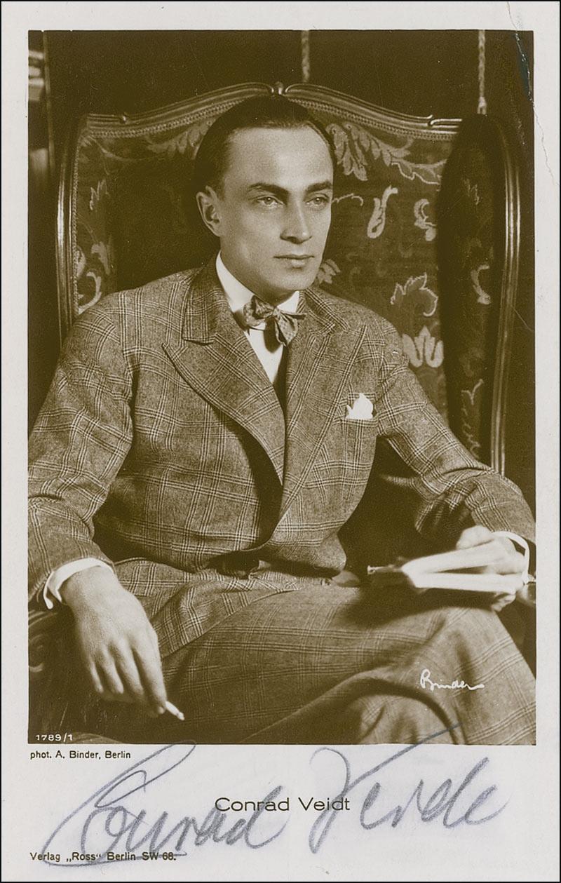 Vintage 3.5 x 5.5 postcard photo of Veidt sitting in a chair with a book on his lap, signed in pencil. In fine condition, with some light soiling around signature and a crease to top right corner.