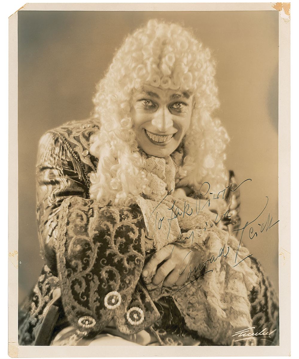 Vintage pearl-finish 8 x 10 doubleweight photo of Veidt as Gwynplaine, in the 1928 film The Man Who Laughs, signed and inscribed in fountain pen to legendary Universal make-up artist Jack Pierce, “To Jack Pierce, Conrad Veidt.” In very good condition, with some light contrast to signature and inscription, missing top left corner tip, some light rubbing to finish, and mounting remnants and surface loss to two corner tips. Photo originates directly from the Jack Pierce scrapbook. Photos of Veidt form this early horror classic in full makeup are virtually nonexistent, combined with being inscribed to the film’s make-up artist, and originating from his collection, elevate this photo to the upper stratosphere of autographed horror images.
