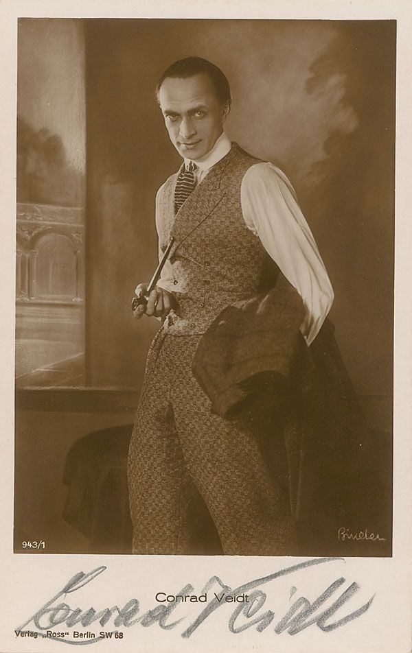 Vintage 3.5 x 5.25 postcard three-quarter length photo of Veidt in a three-piece suit, signed in the lower border in pencil. In fine condition.