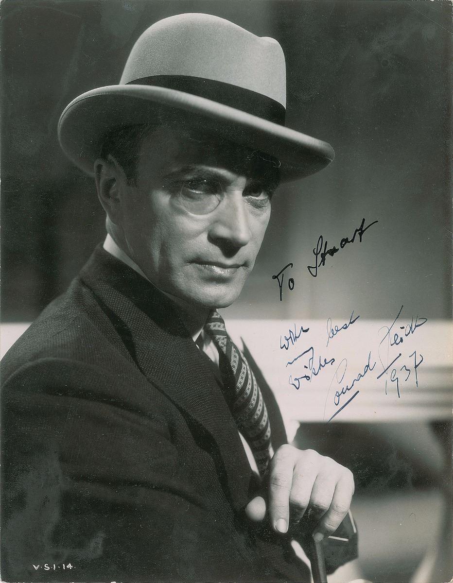 Vintage glossy 7.25 x 9.5 photo of Veidt from Dark Journey, signed and inscribed in fountain pen, “To Stuart, With very best wishes Conrad Veidt, 1937.” In very good to fine condition, with light creases and trimmed edges.