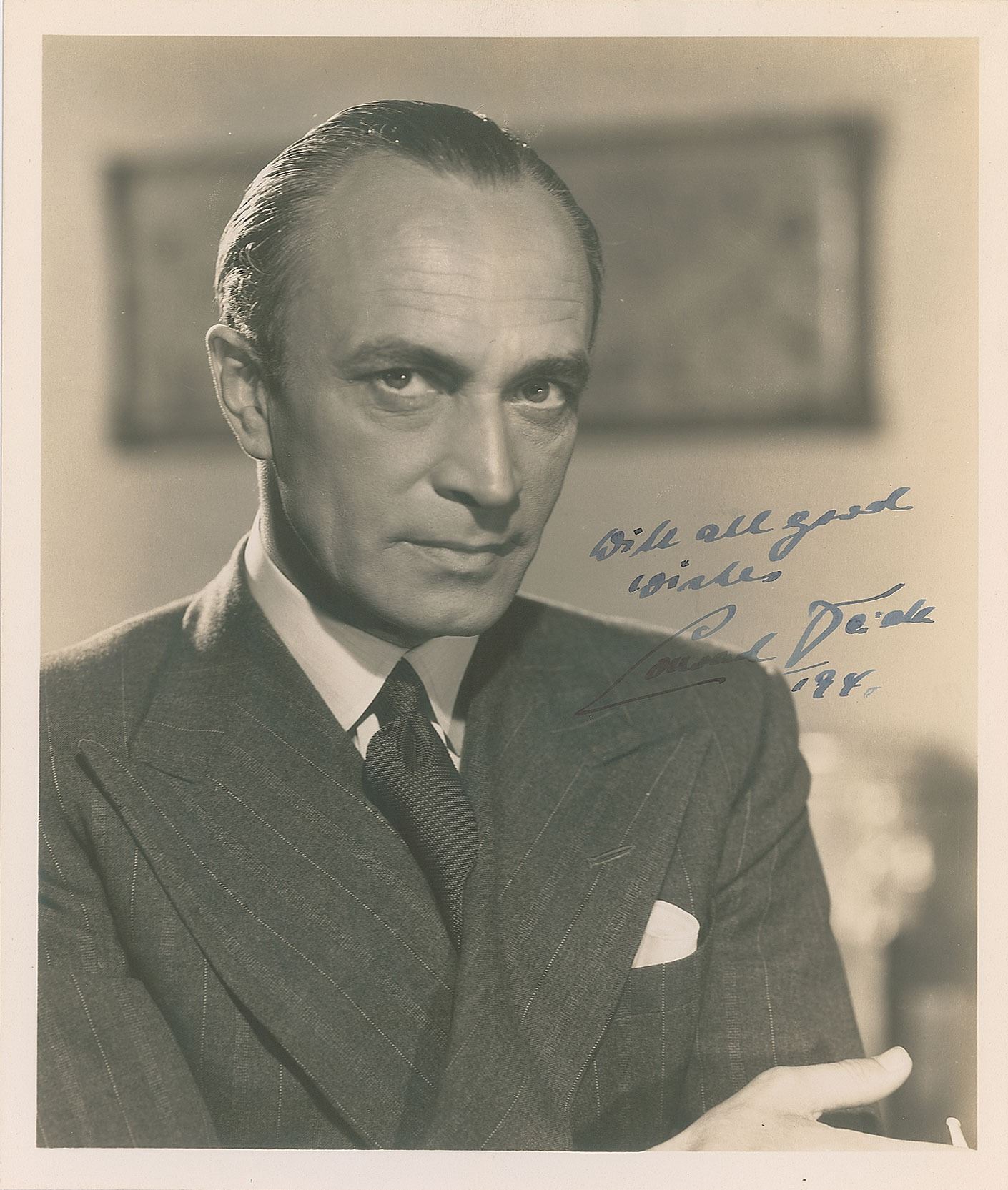 Vintage matte-finish 8 x 9.5 photo of Veidt in a handsome and serious pose, signed in fountain pen, "With all good wishes, Conrad Veidt, 1941." In very fine condition.