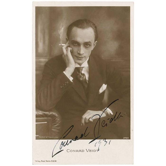 Vintage 3.5 x 5.5 postcard photo of Veidt holding a smoldering cigarette, signed in fountain pen, “Conrad Veidt 1931.” In fine condition. Pre-certified PSA/DNA and RRAuction COA.