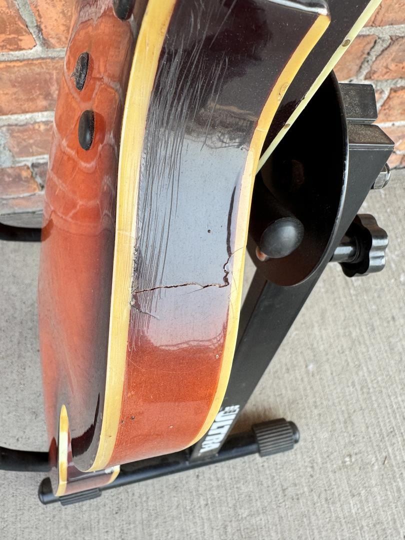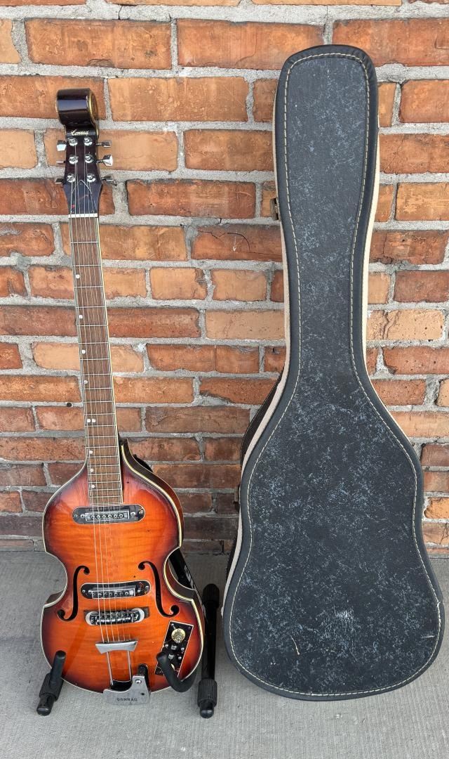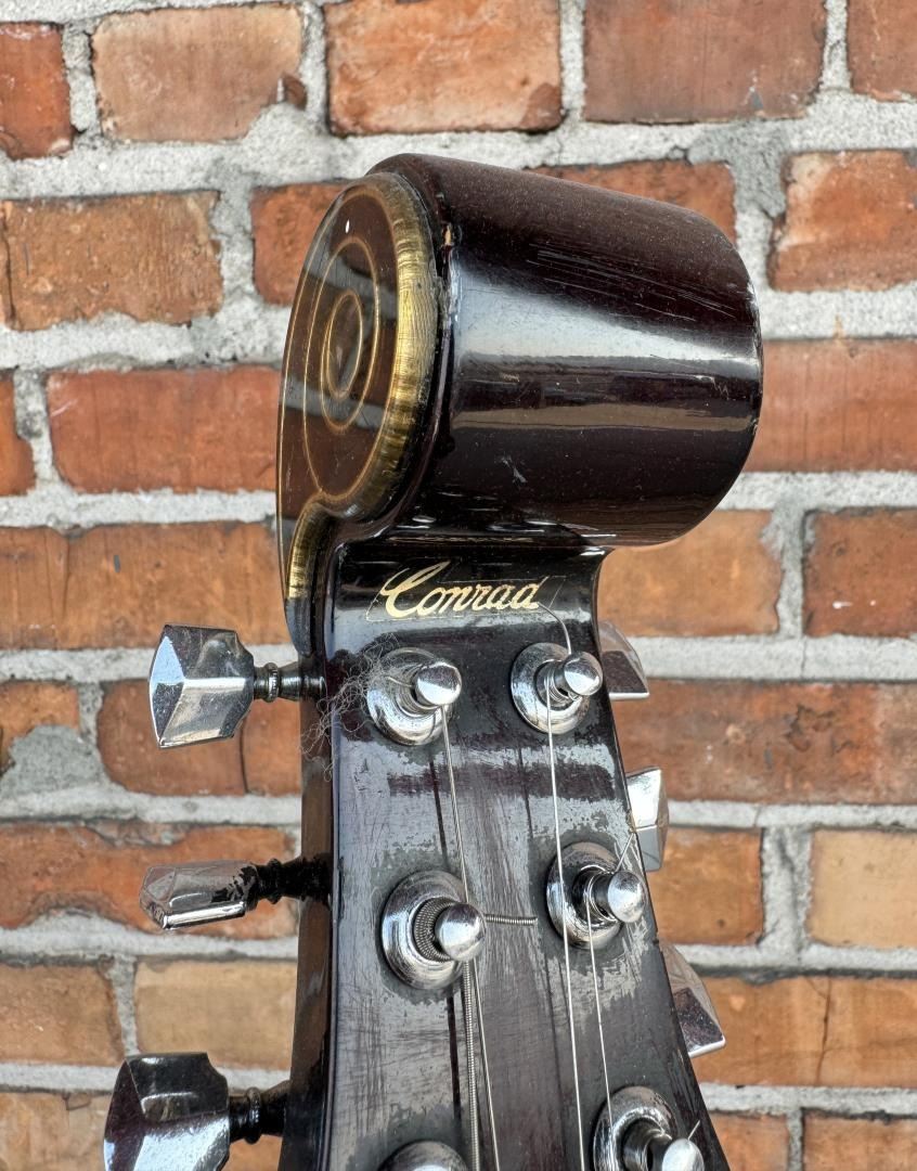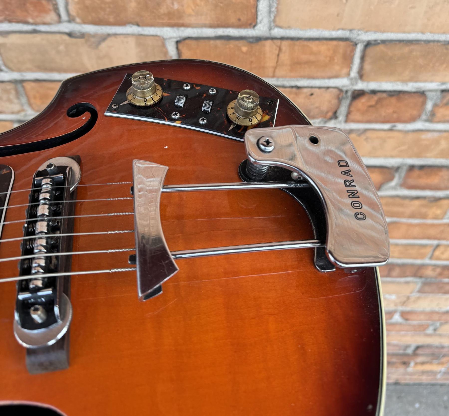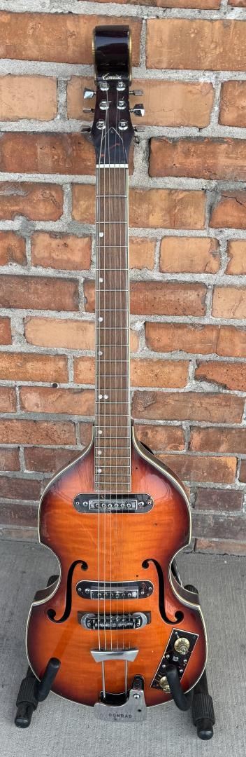 1960s Conrad Violin style electric guitar, 39" overall length. Not working. Cracked body as shown.