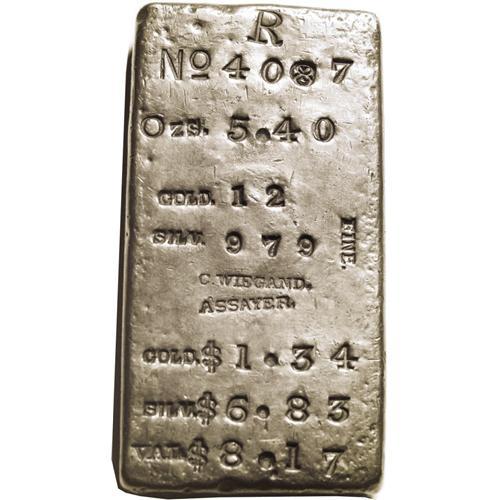 <B>Conrad Wiegand Silver Ingot.</B></I> ca. 1870 to 1885. A second Wiegand ingot. This larger, uniface piece shows all the usual Wiegand imprints but seen here in an expanded version. The imprints read from top to bottom: R / No 4007 (with rosette inside the second zero) / Ozs. 5.40 / GOLD 12 / SILV. 979 / FINE (punched in sideways) / C WIEGAND. / ASSAYER / GOLD $1.34 / SILV $6.83 / VAL $8.17. Medium-deep gray patina over the surfaces.<BR> Wiegand was a notorious assayer, who got his start at the U.S. Mint in San Francisco. His behavior was so disruptive, and assays of questionable quality (they often did not check or agree), that a mint employee once wrote to President Lincoln asking for his dismissal, and the letters are still on file in the Lincoln file in the national library in Washington, DC. He stayed at the branch mint through the early 1860s, before starting his own assay office in Virginia City. He briefly expanded and had two offices, the other in Gold Hill.<BR><I>From The Kagin Reference Collection of Frontier Ingots.</B></I>